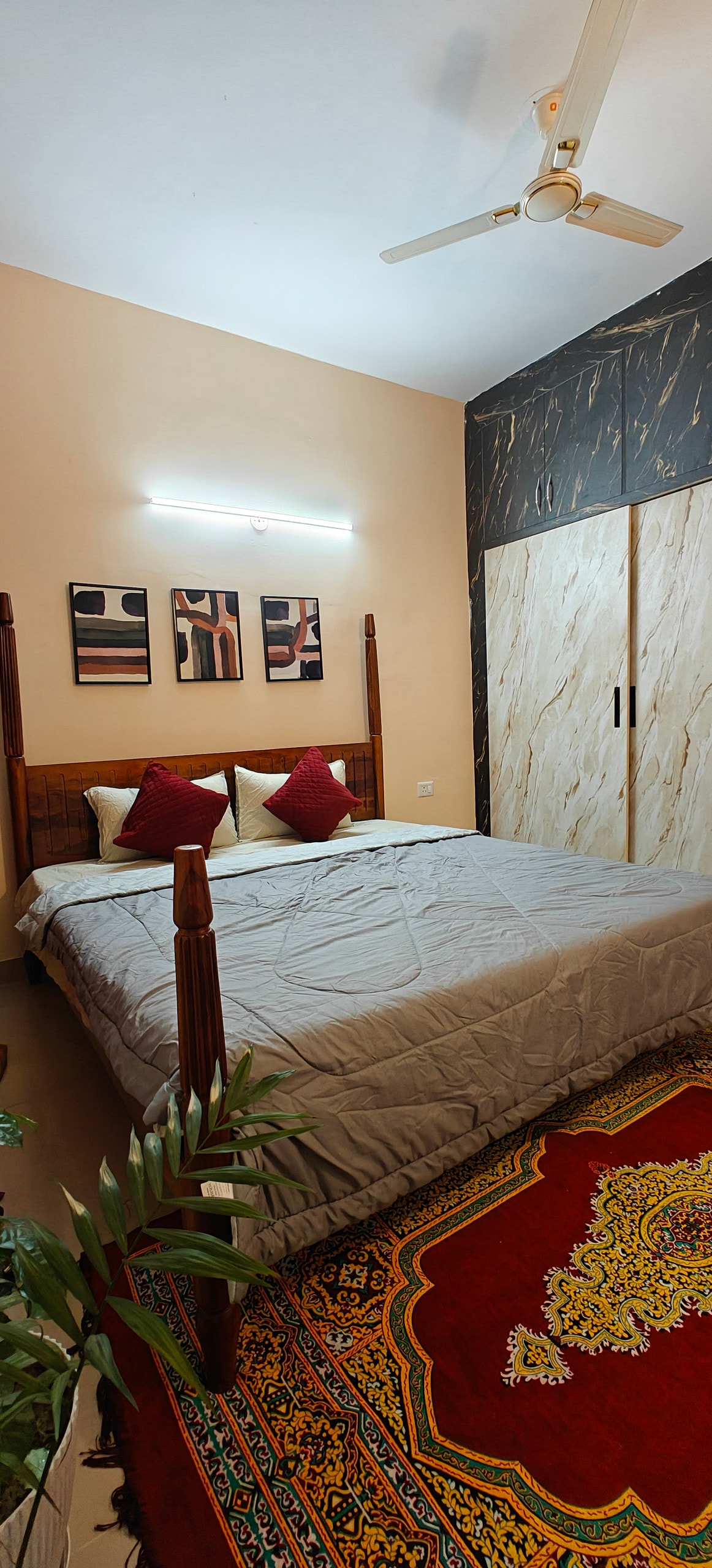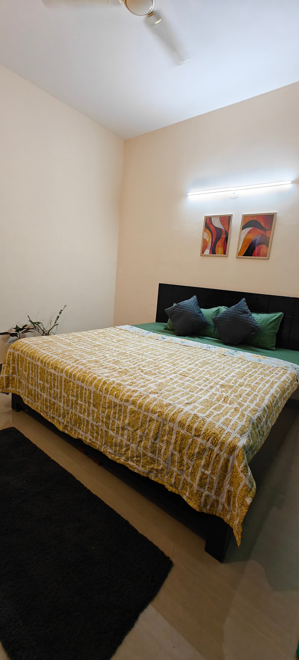 El primer apartamento de 2 Bhk que cumple con todos los requisitos ✨ - 2 dormitorios ( dormitorio principal, segundo dormitorio). - Dos camas tamaño king. - Una amplia sala de estar con una cómoda disposición de asientos. - 2 baños ( 1 en cada uno de los dormitorios). - Cocina pequeña (con todos los utensilios básicos de cocina disponibles y servicios abastecidos, es el lugar perfecto para preparar tus comidas favoritas) - Una zona de balcón compartido que conecta con el apartamento, que puede ser el espacio perfecto para tus paseos nocturnos. ¡Reserva ahora!