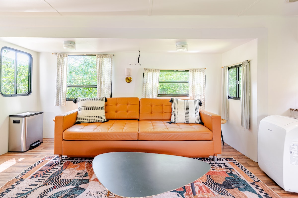 An old school camper, painstakingly renovated to give it a Scandinavian look in the front, and a cozy cabin feel in the bedroom. Extra insulation keeps it warm even on zero degree days! It has flushing toilet, hot shower, AC and a mini kitchen. Located two hours from NYC and close to Hudson, Kaaterskill falls and ski slopes! *Hudson Getaways is a small woman owned business. We offer discounts to our social media followers, to returning guests and during slow seasons.