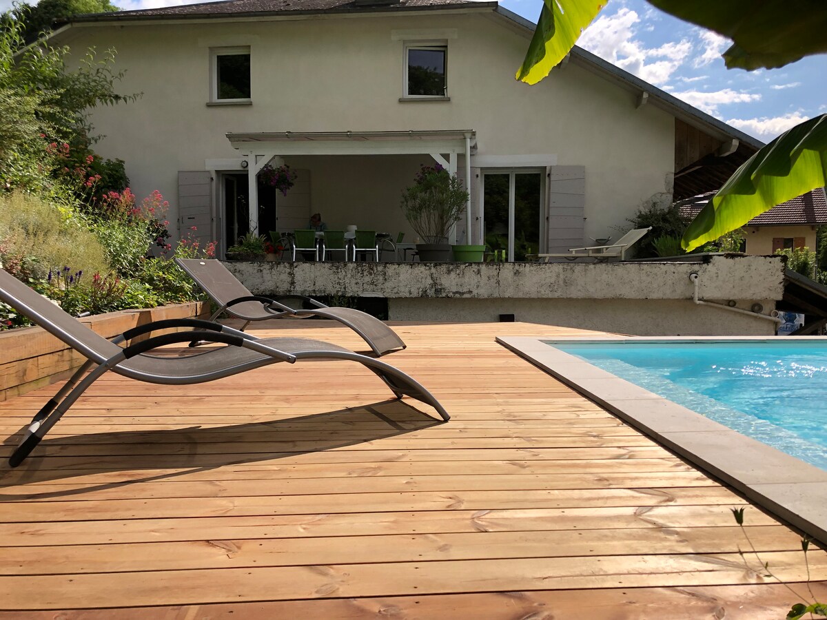 Maison sur 2 niveaux de 130m2, pouvant accueillir jusqu'à 10 personnes. Idéale pour 2 familles. Extérieur non fermé avec terrasse, possibilité de manger dehors Parking gratuit devant la maison. Maison située à 10 mn d'Aix les Bains et de son lac, au pied du Revard et à la porte du magnifique massif des Bauges. Idéalement situé pour des vacances à la campagne près du lac et des montagnes.
