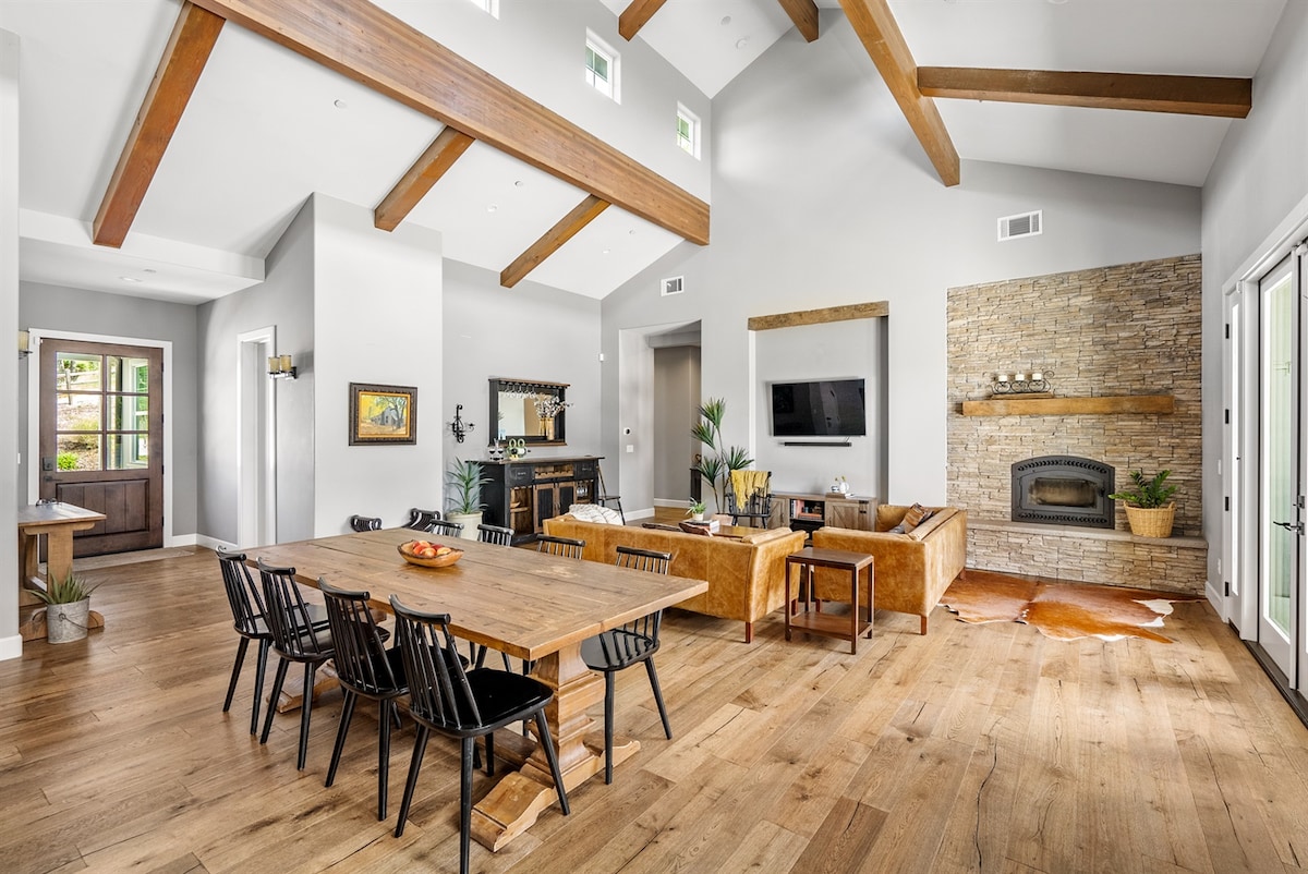 Esta casa es la segunda casa de la propiedad (la casa principal también es STR). Ubicado en la cima de un camino de entrada privado con una hermosa vista de las colinas. Cocina totalmente abastecida con fridg/congelador, lavavajillas, horno, estufa de 5 quemadores, microondas, máquina de hielo, sistema de ósmosis, cafetera exprés totalmente automática. Televisores QLED de 65pulgadas en la sala de estar y los dormitorios. Muebles de patio con cenador cubierto, barbacoa de gas, fumador de pellets/barbacoa, calentadores de patio, mesa de fuego. Jacuzzi con cenador con capacidad para 6 personas. Cargador EV/Tesla en el garaje.