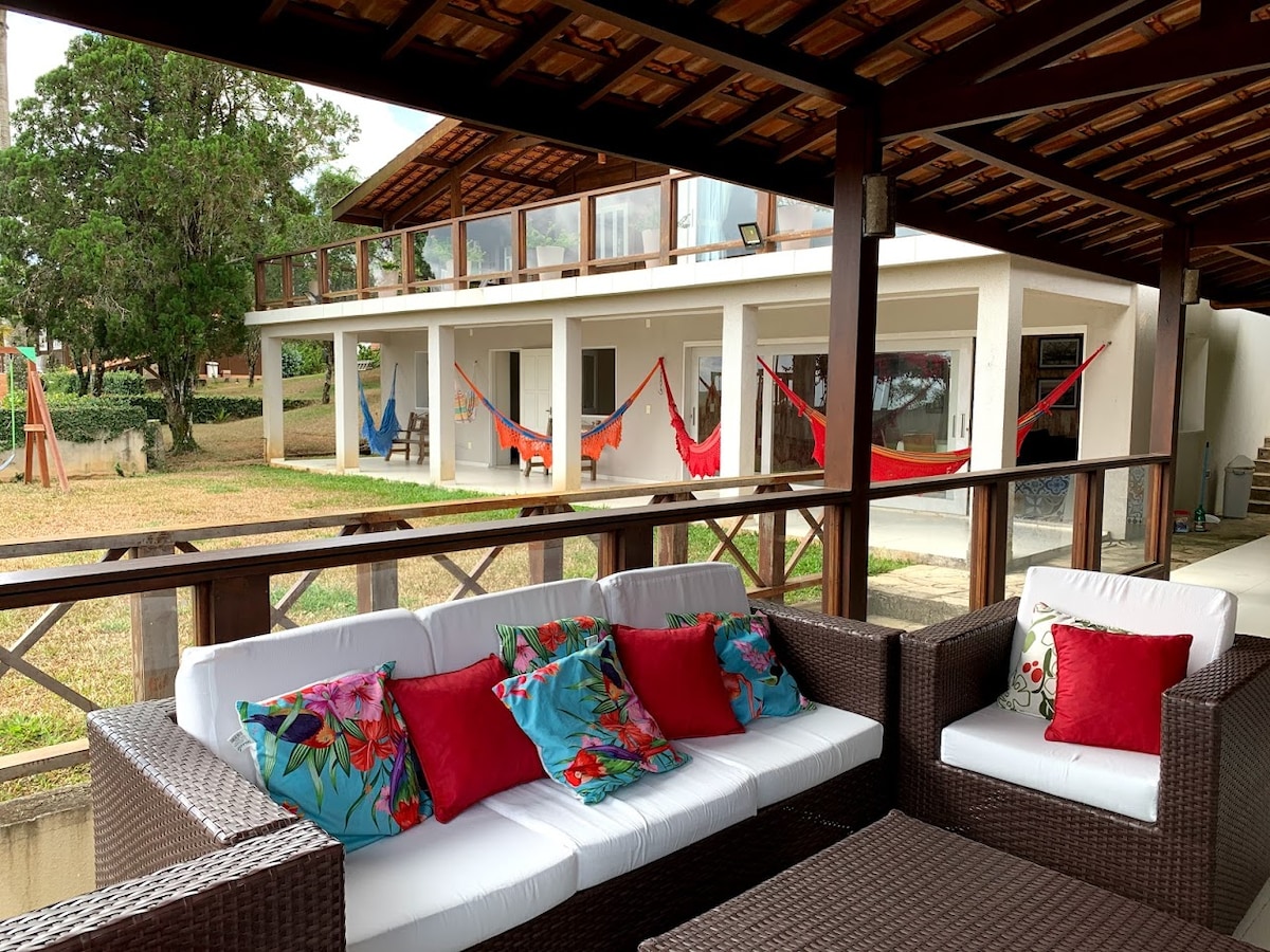 Casa de estilo colonial con 4 suites + 1 dormitorio con baño social. Situado a solo 5 km del centro de Guaramiranga y cerca de las cascadas más famosas de la región, el sitio cuenta con un gran jardín de césped con piscina de agua mineral, sendero para caminar de 2 km de largo, cascada natural en piedra, rueda de agua y cascada en la olla para bañarse con agua perenne. Ven y disfruta de una estadía tranquila y segura en la hermosa naturaleza de Guaramiranga. A 300 metros del asfalto ¡Aceptamos a tu mascota!