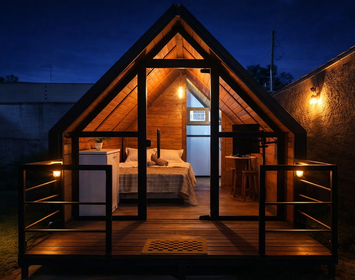 Cabana A-frame charmosa com vista para o mar de todos os cômodos. Conta com SPA para 4 pessoas, rede suspensa para relaxar com a brisa do oceano e fire pit perfeito para noites ao ar livre ou aquele churrasco com o oceano no horizonte. Localização privilegiada, perto de praias, bistrôs, beach clubs e baladas. Estacionamento privativo disponível. Ideal para casais ou famílias que buscam conforto, estilo e natureza.