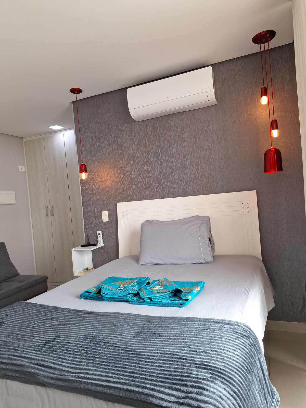 Apartamento a estrenar, en el centro de Guarulhos, bien ubicado, cerca de mercados, restaurantes, bares, centro comercial; Aire acondicionado, lavadora secadora, horno, cocina, nevera, utensilios domésticos, home-office, cerradura electrónica, estacionamiento gratuito, piscina, sauna, gimnasio, entre otros. El apartamento tiene todo lo que necesitas para una gran estancia para períodos cortos o largos. El lugar ofrece cama doble, sofá, TV con Netflix y PrimeVideo.