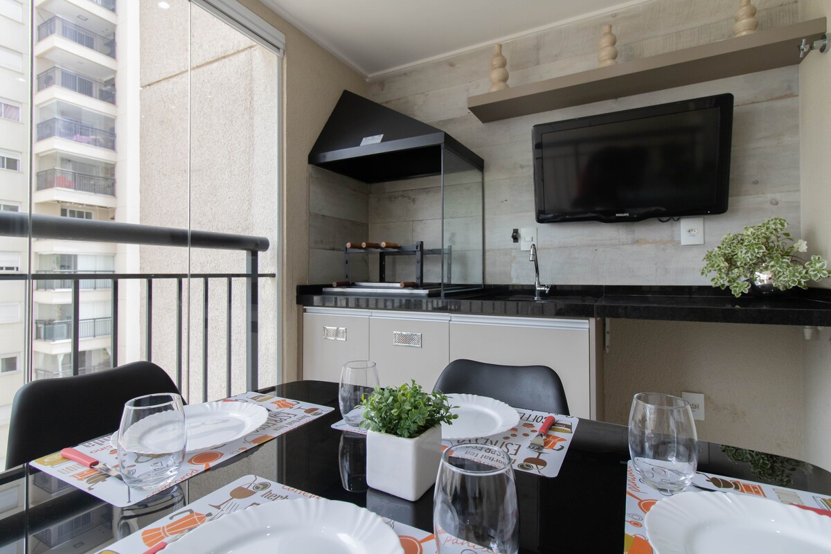Nuevo 1 dormitorio,muy acogedor con: *Garaje, *Gimnasio, *Piscina, *BBQ , * Conserje y seguridad las 24 horas El apartamento está en el barrio más famoso y moderno de Guarulhos. Cuenta con varias opciones gastronómicas y de entretenimiento en el espacio del complejo. Se encuentra a solo 200 metros del verde Bosque Maia y a 9 km del aeropuerto de Guarulhos. Nuestro espacio tiene 1 cómoda cama doble, un sofá en el salón y ofrecemos aire acondicionado, televisores, wifi y ethernet.