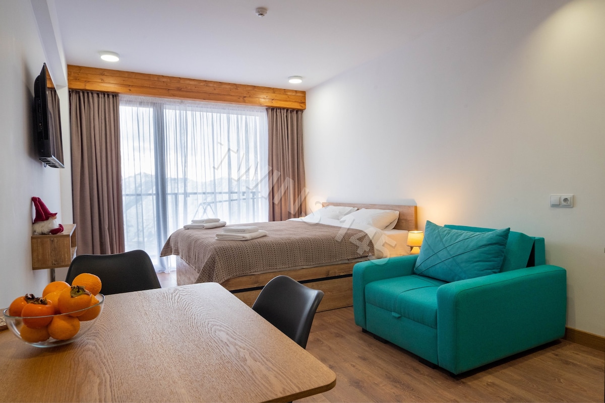 Only one minute walking distance to the main ski lift Gondola .The aparthotel is located in New Gudauri district, Redco Loft 1 . Comes with free locker for ski storage. Free and fast private WiFi . Spacious and cozy studio with mountain view balcony . Netflix and cable, smart large TV. 37 m2 It's fully equipped with all the kitchen amenities for cooking., free Wifi. Supermarket right in the building, all other shops and restaurants, ski rental shops in 1 to 2 minutes walking time.