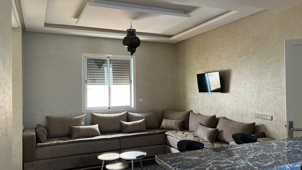 Un departamento nuevo se encuentra justo en el centro de la ciudad. El elogio está dentro de una residencia familiar bien servida (residencia Sidi Ifni Marina) y está a solo dos minutos a pie de la playa, cuidamos bien de este apartamento. Muchas tiendas están cerca, incluyendo un gran supermercado, panadería, cafeterías y restaurantes.