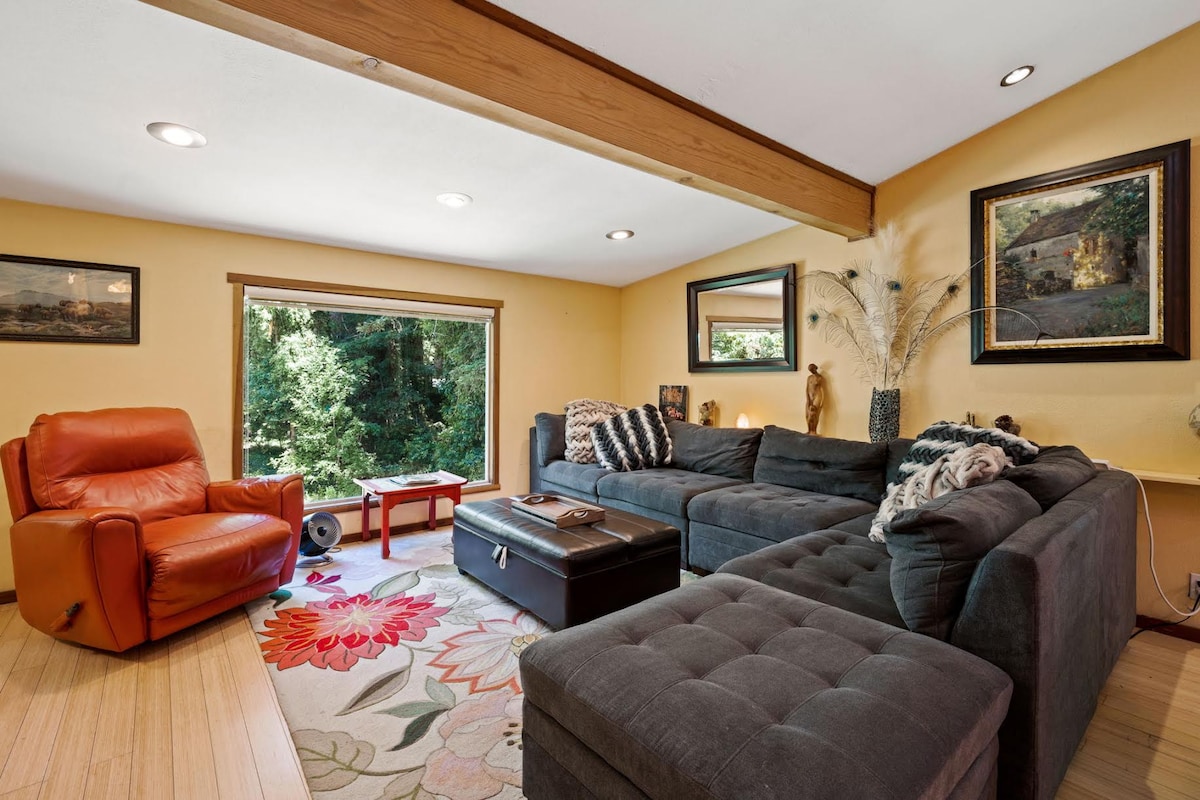 ¡NUEVO! ¡Carga de vehículos eléctricos disponible! Despiértate con mañanas frescas enclavado en los bosques de secuoyas con acceso a tu jacuzzi privado. Flota por el río Ruso y disfruta de las galardonadas bodegas del condado de Sonoma. Al regresar, cena al aire libre en la terraza solárium con barbacoa, chimenea y asientos en el patio con sombrilla en voladizo. Esta moderna casa de campo recién reformada te entusiasmará con sus lujosas comodidades, que incluyen chimenea de mármol, sala de juegos con billar, ping pong y consola de videojuegos retro.