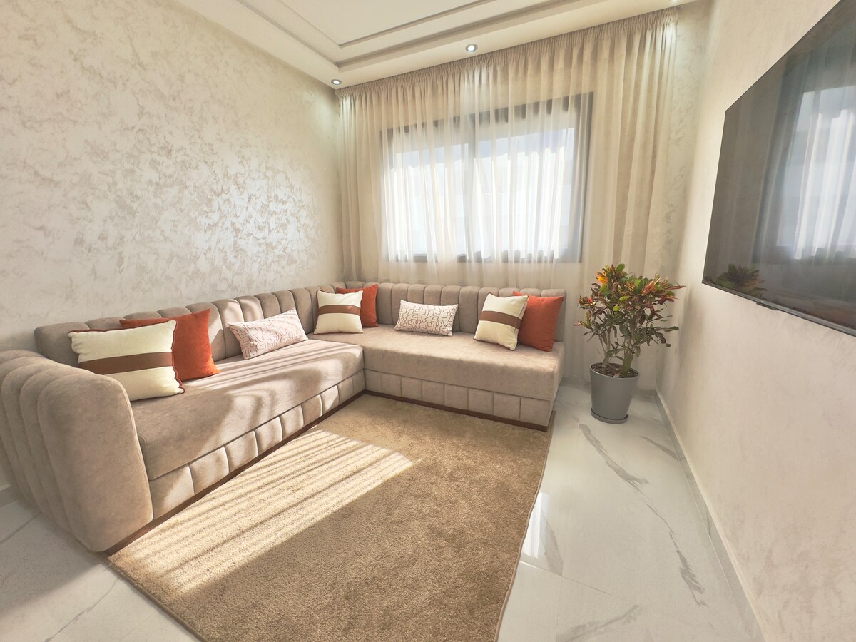 Diviértase con toda la familia en este elegante alojamiento. Apartamento en una residencia segura y cerrada, cerca del aeropuerto y las playas de Tánger... Una amplia sala de estar con sillones de calidad, un televisor inteligente de 50 pulgadas. un dormitorio principal con vestidor, 2.º dormitorio con dos camas separadas y el conjunto con colchones médicos Simons. una cocina bien equipada, totalmente eléctrica con 0 equipos de gas para su seguridad. una amplia ducha con un calentador de agua eléctrico Junkers.