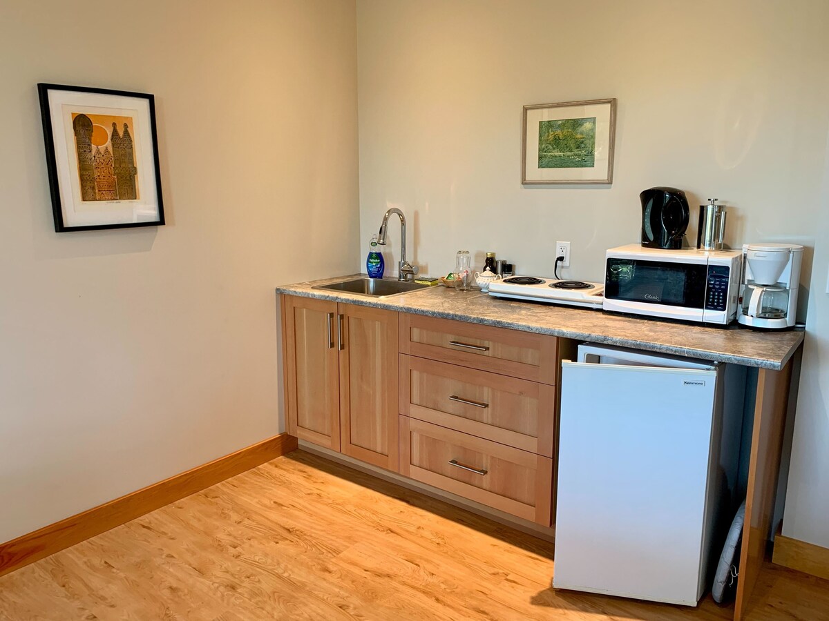 Suite privada y soleada de 400 pies cuadrados con jardín. Esta suite bien equipada tiene una acogedora sala de estar con estufa de leña, cocina pequeña, dormitorio separado con cama tamaño queen y un baño con una lujosa bañera con patas y ducha. La suite tiene su propia entrada, una zona de estar al aire libre dentro de un jardín privado y vallado lleno de árboles frutales, plantas perennes y colibríes. El uso exclusivo incluye una lavadora/secadora. Wifi y aparcamiento incluidos. No apto para niños/personas con problemas de movilidad.