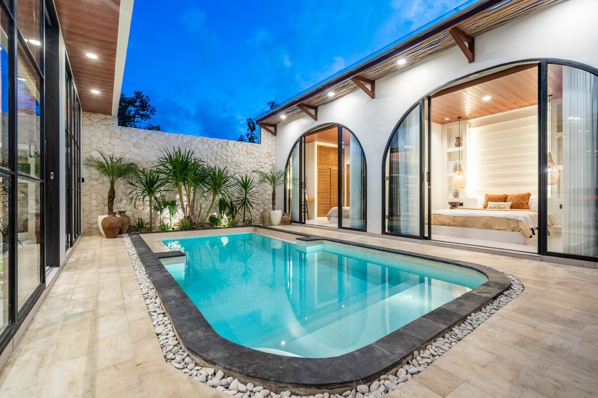 Villa nueva en Ungasan: • Elegante dormitorio con aire acondicionado y vistas a la piscina • 1,5 baños, uno con bañera, artículos de tocador y secador de pelo • Cocina totalmente equipada. • Gran piscina, amplio patio y jardín para relajarse o para veladas románticas • Escritorio, caja fuerte y plancha - Wifi de 300 Mbps. • Limpieza diaria con toallas y sábanas frescas • Servicio de conserjería para excursiones y más • Netflix y PS5, artículos para bebés, artículos de playa, parrilla para barbacoa por solicitud • Se admiten mascotas • Depósito reembolsable de 500.000 IDR