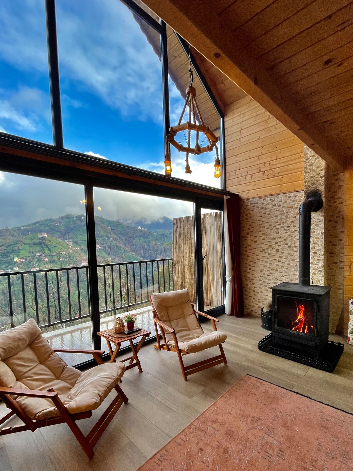- Nuestra casa bungalow ha sido diseñada completamente de madera y auténtica. - Nuestra casa de bungalow tiene una chimenea y tiene magníficas vistas al valle y a la montaña. - Nuestra habitación tiene un ancho de 45 m2. - Es un concepto que las parejas de luna de miel pueden elegir fácilmente. - El piso inferior tiene forma de sala de estar; hay una cama doble en el piso superior, como balcón, sofá, baño, TV, minibar, etc.