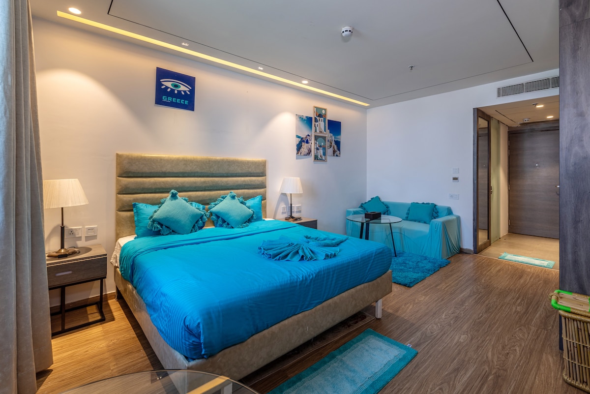Welcome to Aurelia Luxe, your serene escape on Golf Course Extension Road, Gurgaon. Warm tones, soft textures, and a private balcony create a soothing retreat, designed for families, solo travelers, and couples seeking the perfect blend of comfort and elegance. Guests also enjoy access to building amenities including a swimming pool and gym Indulge in nearby dining spots, and enjoy the convenience of hassle-free connectivity via the Sector 55-56 Gurgaon rapid metro and Huda City Centre metro