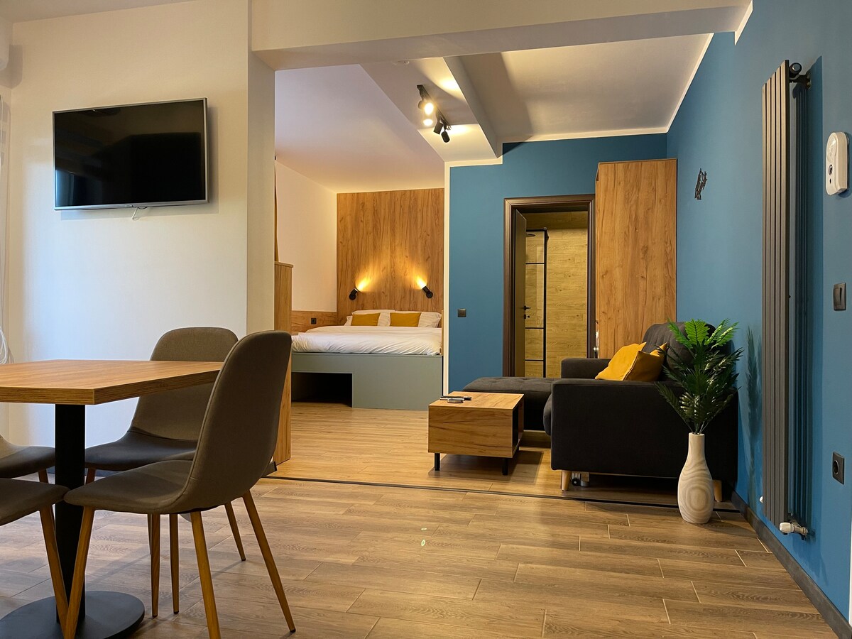 Nuestro departamento está a pocos pasos de Piata Mare (Grand Square) en Sibiu. Ubicado en un edificio histórico de 200 años de antigüedad, cuenta con un acogedor dormitorio, sala de estar con TV inteligente (Netflix), wifi rápido y cocina totalmente equipada con cafetera, estufa y lavadora. La calefacción central mantiene las cosas calientes en invierno y el aire acondicionado está disponible durante el verano. Una pequeña terraza privada agrega encanto adicional, perfecta para relajarse después de un día explorando la ciudad.
