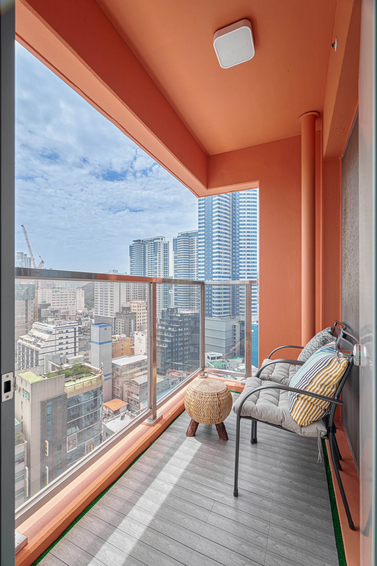 Terraza con bonitas vistas al mar en Haeundae frente a un edificio de gran altura / 1 cama queen + sofá cama + 2 habitaciones con todas las comodidades