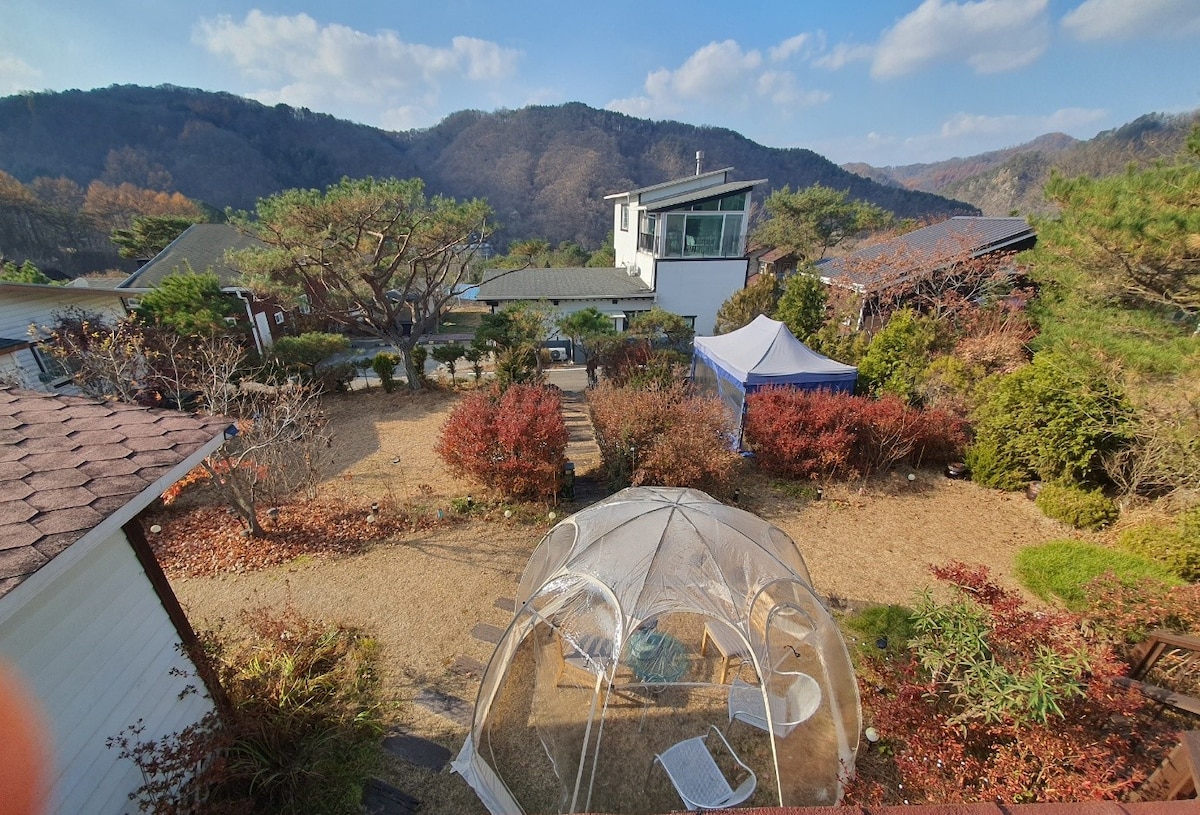 숲세권 독채 별장 촌캉스 내 집처럼 불멍,따사한 투명 텐트에서 별보고 조용히 힐링!