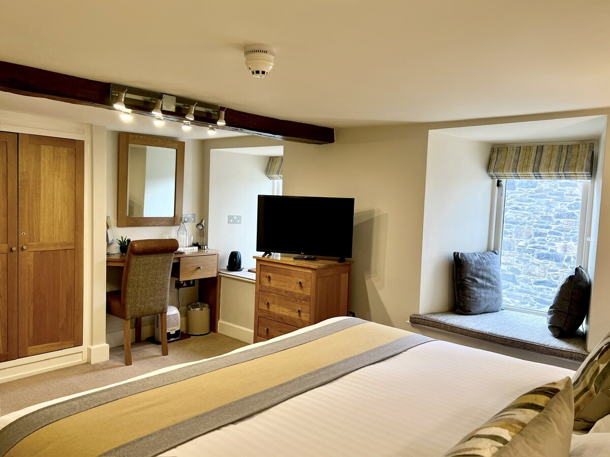 Una de nuestras habitaciones dobles en la parte trasera de la propiedad con baño propio y ducha, una cama doble con almacenamiento debajo de un televisor inteligente conectado a una red rápida, ropa de cama y toallas frescas, secador de pelo, jabón de champú y agua. El trastero está disponible para bicicletas. La habitación solo se ofrece habitación, con cafetería, bar tradicional y sala de juegos. A partir de la propiedad, das numerosos paseos y tienes senderos para bicicletas de montaña y pesca de salmón a la vuelta de la esquina.