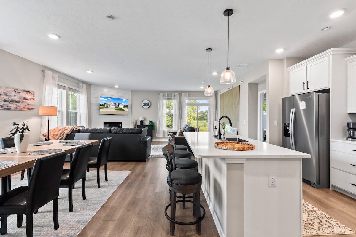Nueva piedra marrón de concepto abierto con garaje para 2 coches a 2,4 millas del complejo deportivo Grand Park y a poca distancia a pie de «Restaurant Row» y del parque Grand Junction. Con acceso rápido a las autopistas 31 y 32, estarás a pocos minutos de las tiendas de Clay Terrace, del centro de Carmel o de Noblesville, con una gran variedad de opciones gastronómicas en el medio. Perfecto si buscas un alojamiento cómodo, cuando no estés viendo un partido en Grand Park o asistiendo a un evento/boda local. ¡Lee los pies de foto para obtener más información sobre la propiedad! (Capacidad para 6 personas)