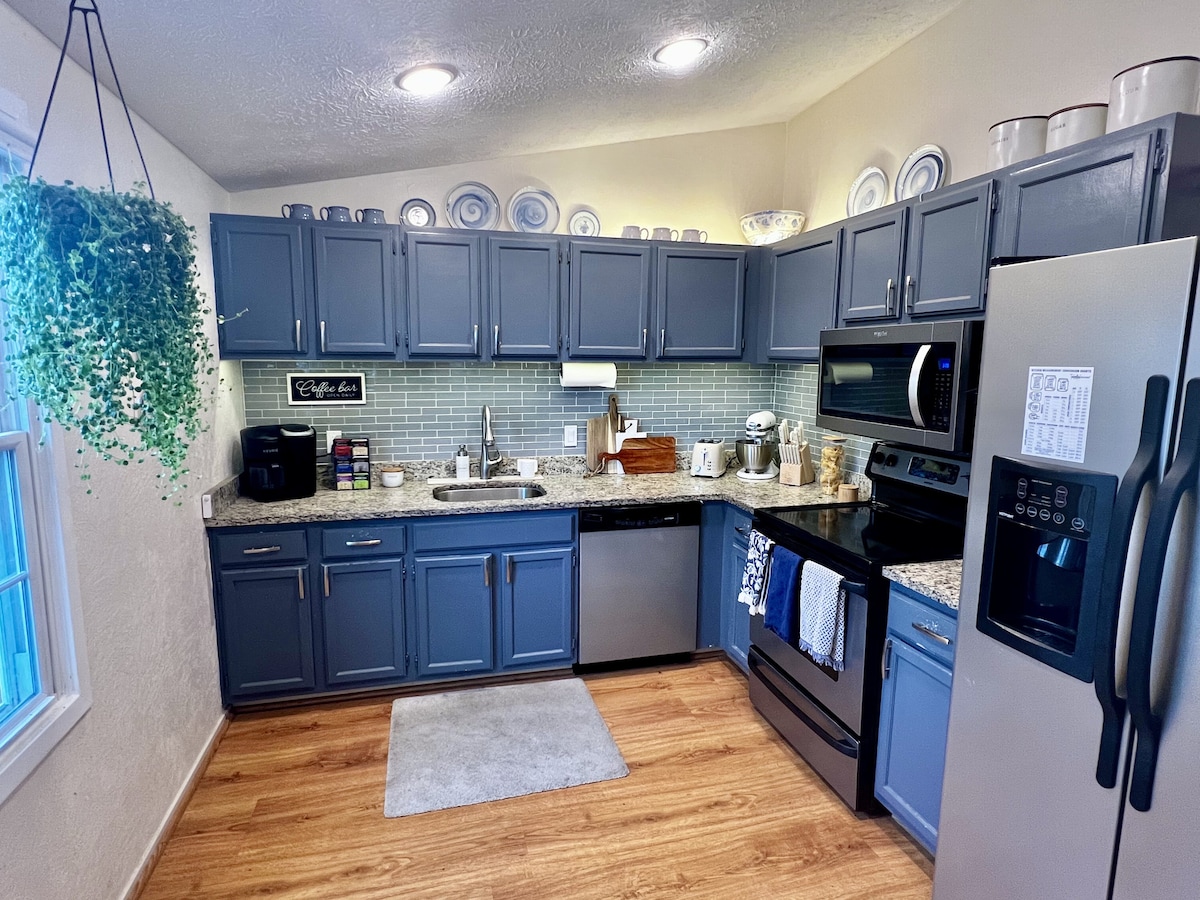 Trae a toda la familia a quedarse en nuestra espaciosa casa para dormir hasta 8 personas con 3 dormitorios (2 camas tamaño queen, uno con baño privado y 2 camas individuales), una cocina completa con cafetera y un sótano terminado con mesa de billar, bar, gimnasio y oficina con escritorio de pie. Disfruta de un patio cubierto, terraza, mesa de fuego, acceso al agua al río Gunpowder, 2 kayaks y carga de vehículos eléctricos de cortesía.