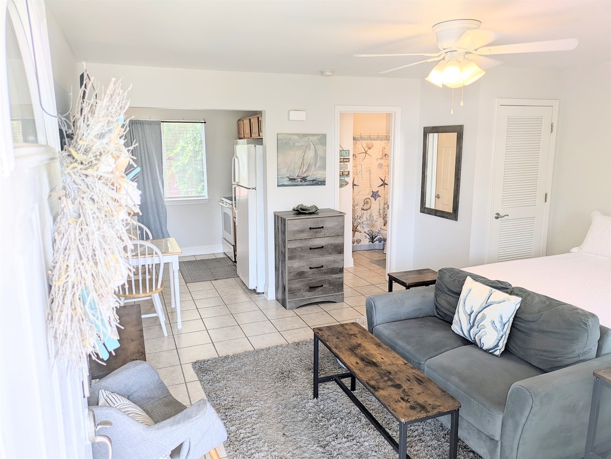 Relax and unwind in this cozy, chic and very welcoming space. This unit has been completely renovated and upgraded with modern luxurious touches all to help make your stay most comfortable. This unit also faces south with a slight beach view and sea breeze. Unit is top floor (stairs) and backs up to the mailboxes, when the blinds are open, beautiful trees are the view! 50 inch smart TV, equipped with Amazon Firestick, quartz countertops, 5G Wifi and normal wifi available