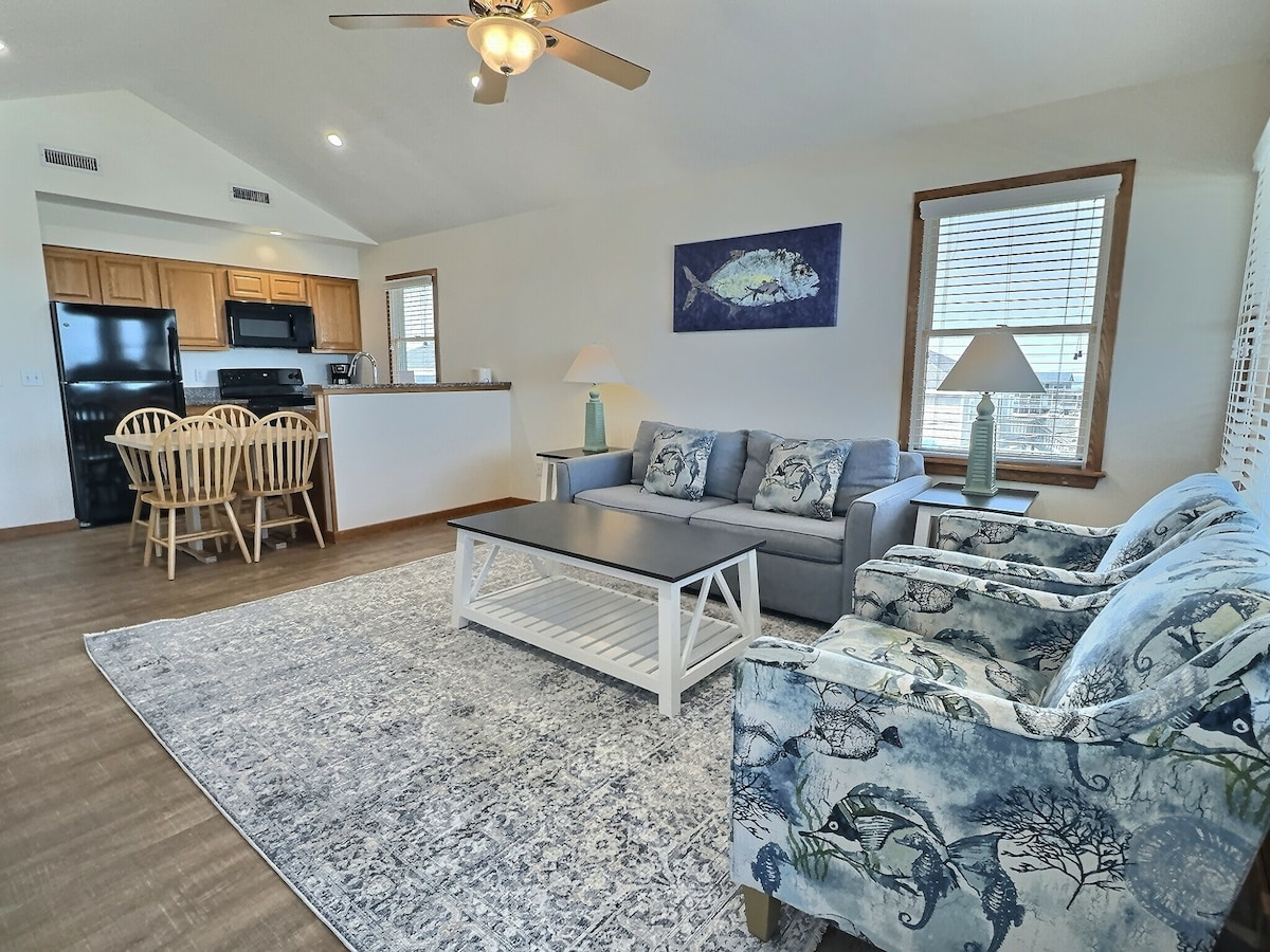 Nuestro apartamento remodelado es el lugar perfecto para tus vacaciones. Muebles nuevos y alfombras Big Pool, Two Marinas, Best Beach justo al otro lado de la carretera y el ferry Orcacoke justo al salir de tu puerta. Las tiendas y los restaurantes de Hatteras Landing están justo al lado. Puedes alquilar carritos de golf cercanos, bicicletas, kayaks, SUP o alquilar un barco para pescar. La cama king y el sofá cama tamaño queen tendrán capacidad para 4 personas. Cocina con electrodomésticos nuevos, incluido un horno de convección para todas las necesidades culinarias. ¡Primer piso junto a la piscina!