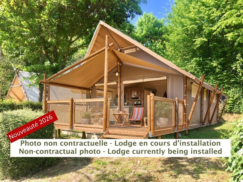Tienda de lona de PVC en terraza de madera. Tienda Lodge compuesta por: - 2 habitaciones (una habitación con 1 cama de 140 x 190, la otra habitación con 3 camas de 80 x 190, incluida una litera), - Una cocina equipada (nevera, cocina de gas de 2 fuegos, fregadero, microondas, cafetera eléctrica, hervidor de agua, vajilla y utensilios de cocina), - Un cuarto de baño con lavabo, ducha e inodoro, - Una terraza de madera de 8 m² cubierta.