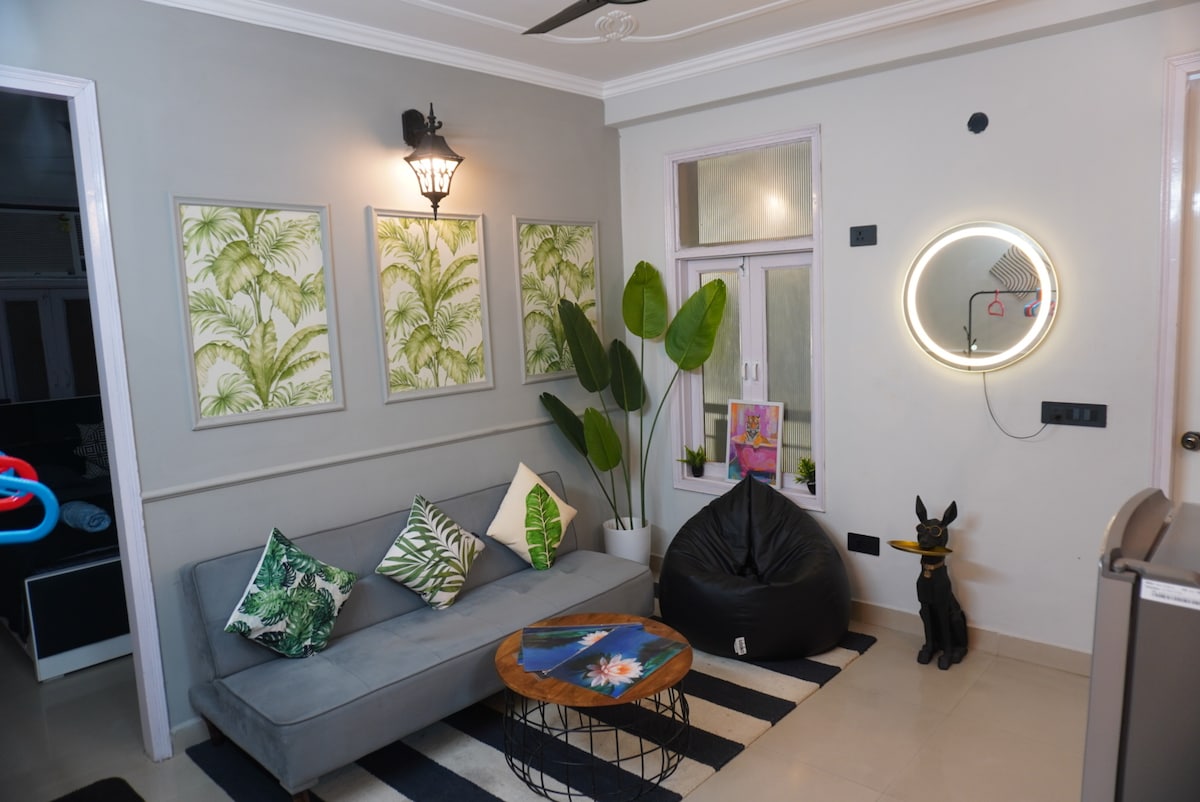 ¡Te damos la bienvenida a tu hogar lejos del hogar en la histórica zona de Mehrauli de Delhi! Este encantador apartamento independiente de 2 dormitorios ofrece una mezcla perfecta de comodidad y conveniencia. Perfecto para familias o parejas, el apartamento ofrece un refugio tranquilo y bien comunicado con la ciudad. Tu espacio privado • 2 dormitorios, 2 baños, sala de estar y balcón • Equipado con servicios esenciales como vajilla de cocina, cocina de gas, artículos de tocador, asegurando que todas sus necesidades sean atendidas.