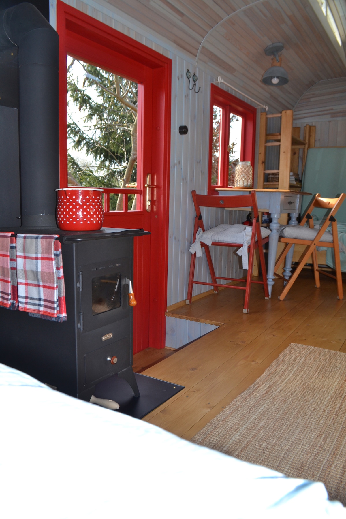 Experimenta la paz y la tranquilidad, el gorgoteo del arroyo, el canto de los pájaros y nada más. Solo calma. Encontrarás un aeropuerto para dos personas y una cama supletoria para una. Cocina pequeña, agua corriente, estufa de gas y platos básicos, todo para tres personas. Hay azúcar, pimienta y sal disponibles. Puedes hacer café en una cafetera Moka. Calefacción diésel. ¡La electricidad es de un panel solar y una batería de 12 V para autos! La ducha exterior y el fogón están debajo de la casa del árbol. Kadibudka es desordenado 🙂 Espacio de estacionamiento. Estancias de primavera-verano