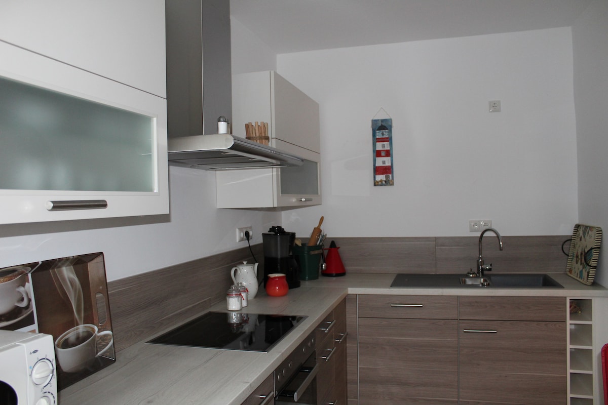 Kleine, offen gestaltete Ferienwohnung/ Einliegerwohnung im Erdgeschoß mit Einbauküche (Kaffeemaschine, Toaster, Wasserkocher, Kühlschrank mit Gefrierfach), Bad (Shampoo, Duschgel etc.) mit Dusche und WC, Handtücher, Bettwäsche, Föhn. Schlafzimmer mit Kleiderschrank, Wohnzimmer mit Schlafsofa, Esstisch, TV. Sagt uns gerne Bescheid wenn wir die Schlafcouch beziehen sollen. Familie mit Kinder sind herzlich willkommen, es ist ein Hochstuhl vorhanden sowie verschiedene Spielsachen.