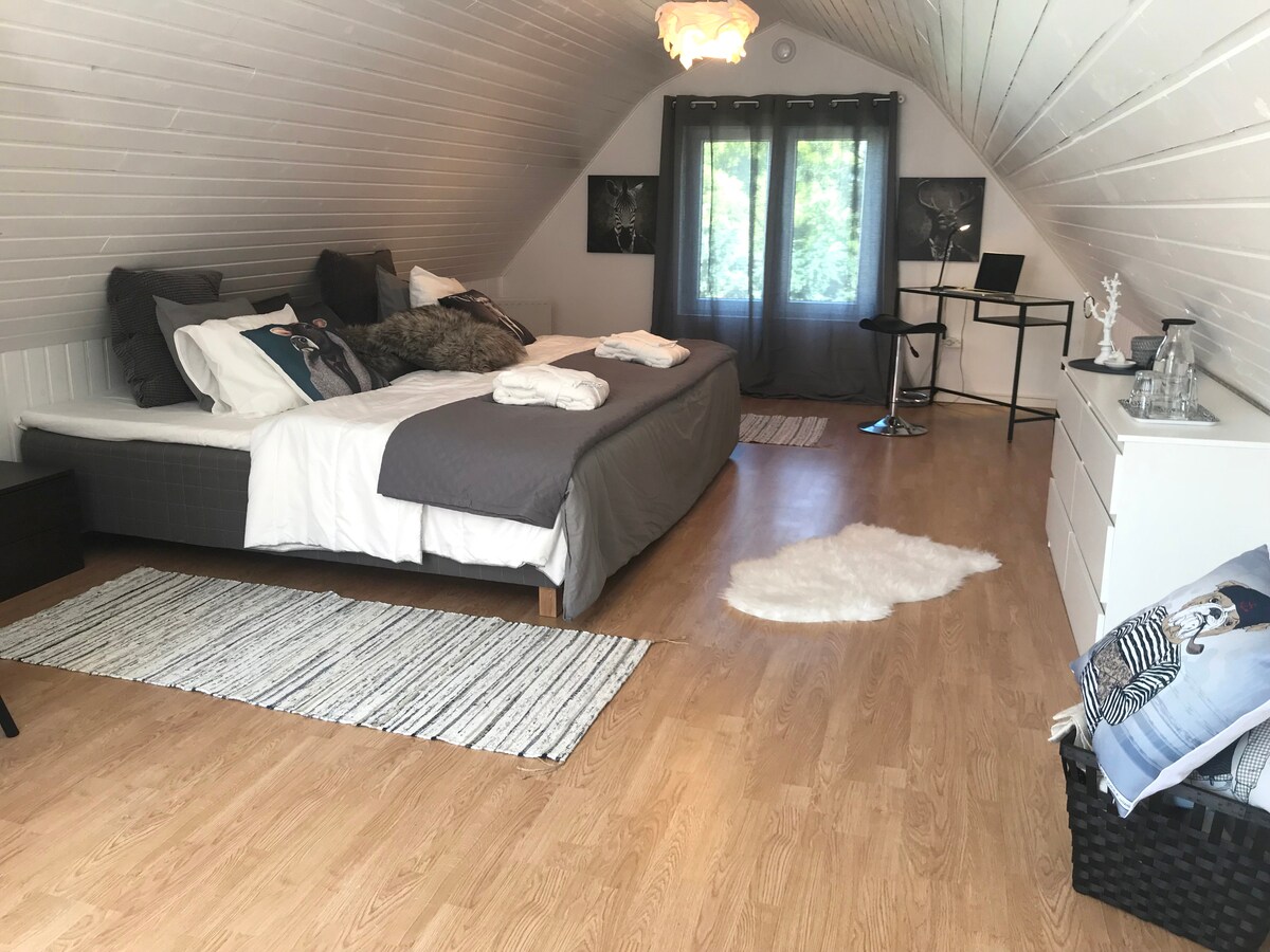 Casa de huéspedes de nueva construcción en el jardín de la familia anfitriona, con baño y ducha propios, situada lo suficientemente lejos como para no ser molestada por la autopista E6, pero lo suficientemente cerca como para poder aparcar a dos minutos de la misma. Lugar tranquilo y rural con pocos vecinos. No hay problemas con el aparcamiento y para los conductores de coches eléctricos hay opciones de carga a precio de coste. La carga se paga en el lugar. Se aceptan SEK, EUR y Swish.