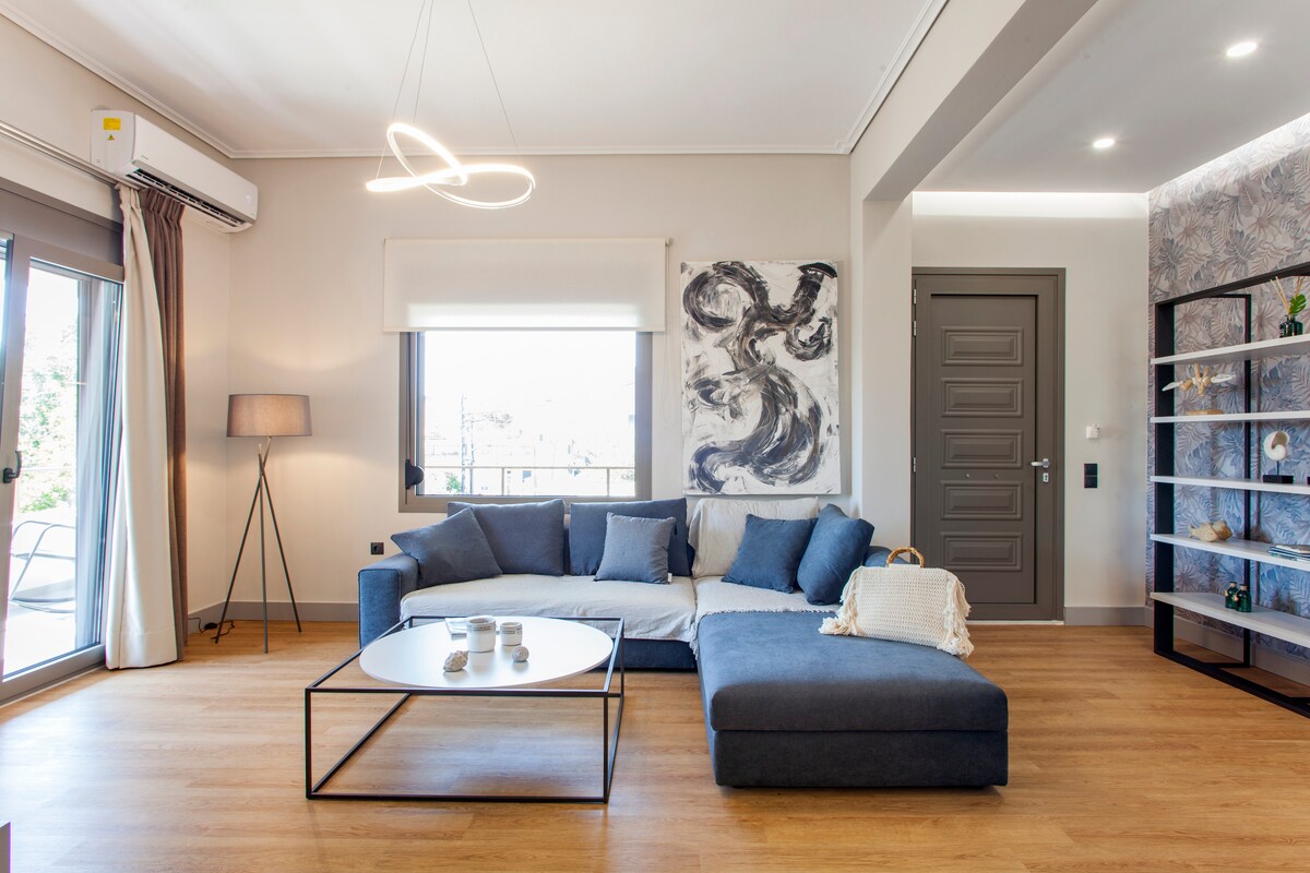 Apartamento azul claro en el corazón de la ciudad de Heraclión. Adecuado para todos aquellos que desean, durante su estancia, fácil acceso al centro de la ciudad, ya sea viajeros, familias numerosas o grupos de amigos. Cuando se ponga el sol, prepárate para disfrutar de unas vistas nocturnas únicas a través de las amplias ventanas de pared a pared, ¡sintiendo el ritmo de la ciudad!