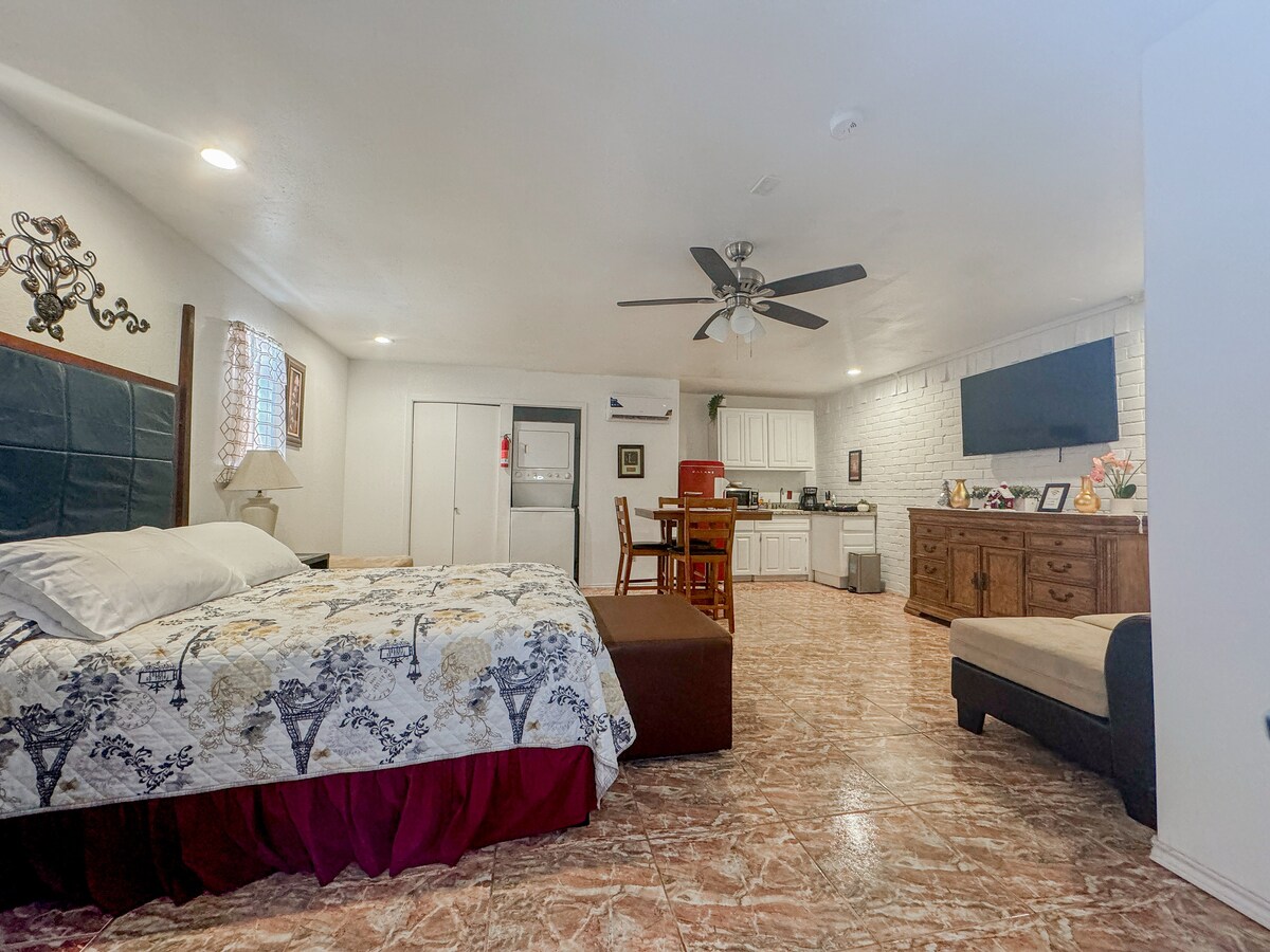 This modern studio is fully equipped with kitchenette, washer and dryer and is perfect for long stays. Our guest studio is detached from the main house. The studio is located in the backyard with a private entrance. Located in a beautiful and safe Edinburg subdivision. You can park in front of the house and go to through the patio wood door which will be designated in check in instructions after booking.