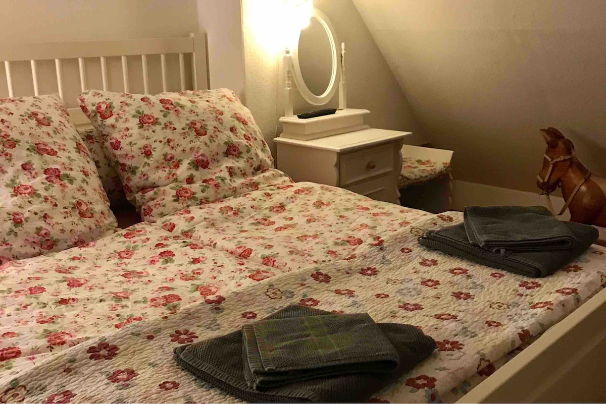 This loft apartment is cosily furnished and has plenty of space in which to relax. The spacious bedroom has a double bed, and the large sofa in the living room can be transformed into a single or double bed. A baby bed is also available upon request. Booking in and out timings can be flexible and can easily be arranged prior to arrival. Bad Iburg's Castle, spa gardens and local centre are but a few minutes walking distance away.