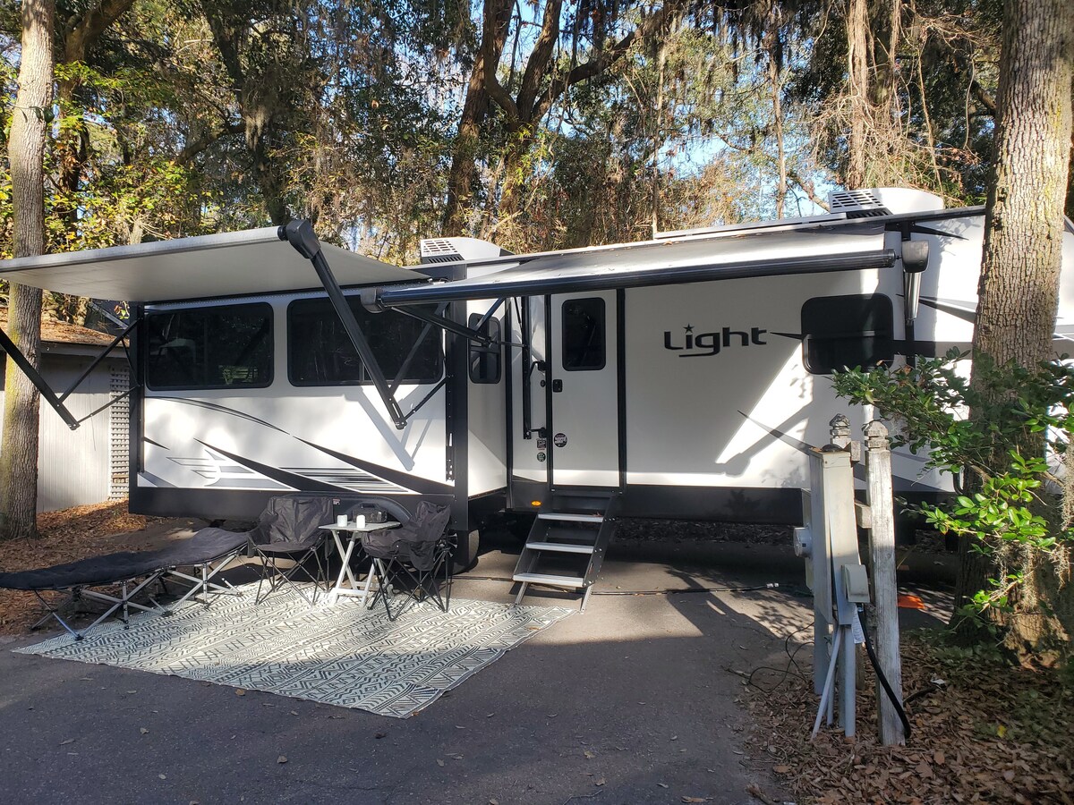 Tranquilo y privado. El RV es una casa rodante de 38 pies de 2017. Está estacionado junto a un estanque de 1/2 acre con peces, patos, águilas pescadoras, garzas, muchos otros animales salvajes. Tienes tu propio porche sobre el estanque. Hay senderos para caminar. Se encuentra a unos 5 kilómetros del centro de Bluffton y a unos 8 kilómetros de Hilton Head Is. Refrigerador de tamaño completo y cocina completa. También hay cabras, cerdos, gansos, gallinas y ardillas.