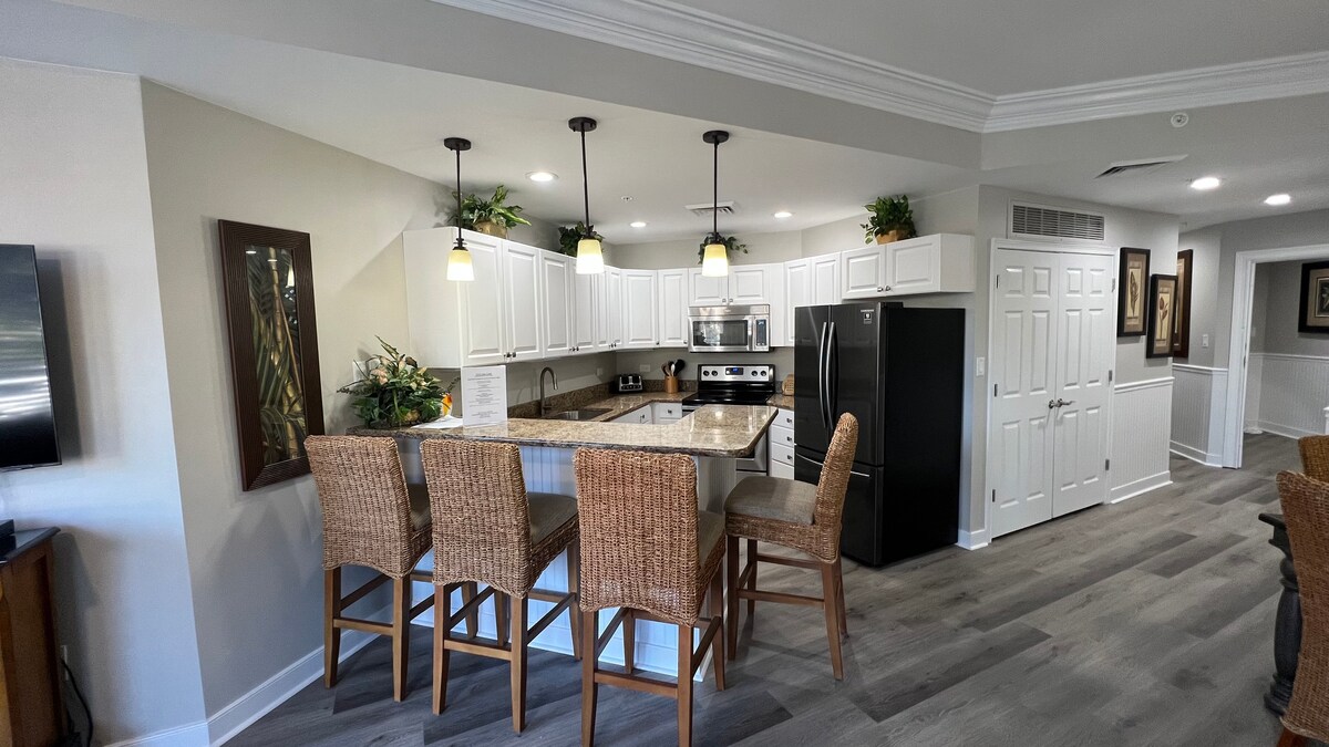 Beautiful 2 Bedroom Oceanfront Condo just steps from the Beach renovated in 2022 with many upgrades such as: *Freshly painted with all new flooring throughout *New 55 inch Samsung Smart QLED TV in living room *New 43 inch Samsung Smart QLED TV in both bedrooms *New Samsung French Door Refrigerator *New Keurig *New Tommy Bahama bedding and pillows *New ceiling fans with LED lights *Updated bathrooms *LED lights throughout *New closet fixtures *New doorknobs & hinges *Non Smoking Unit *No Pets