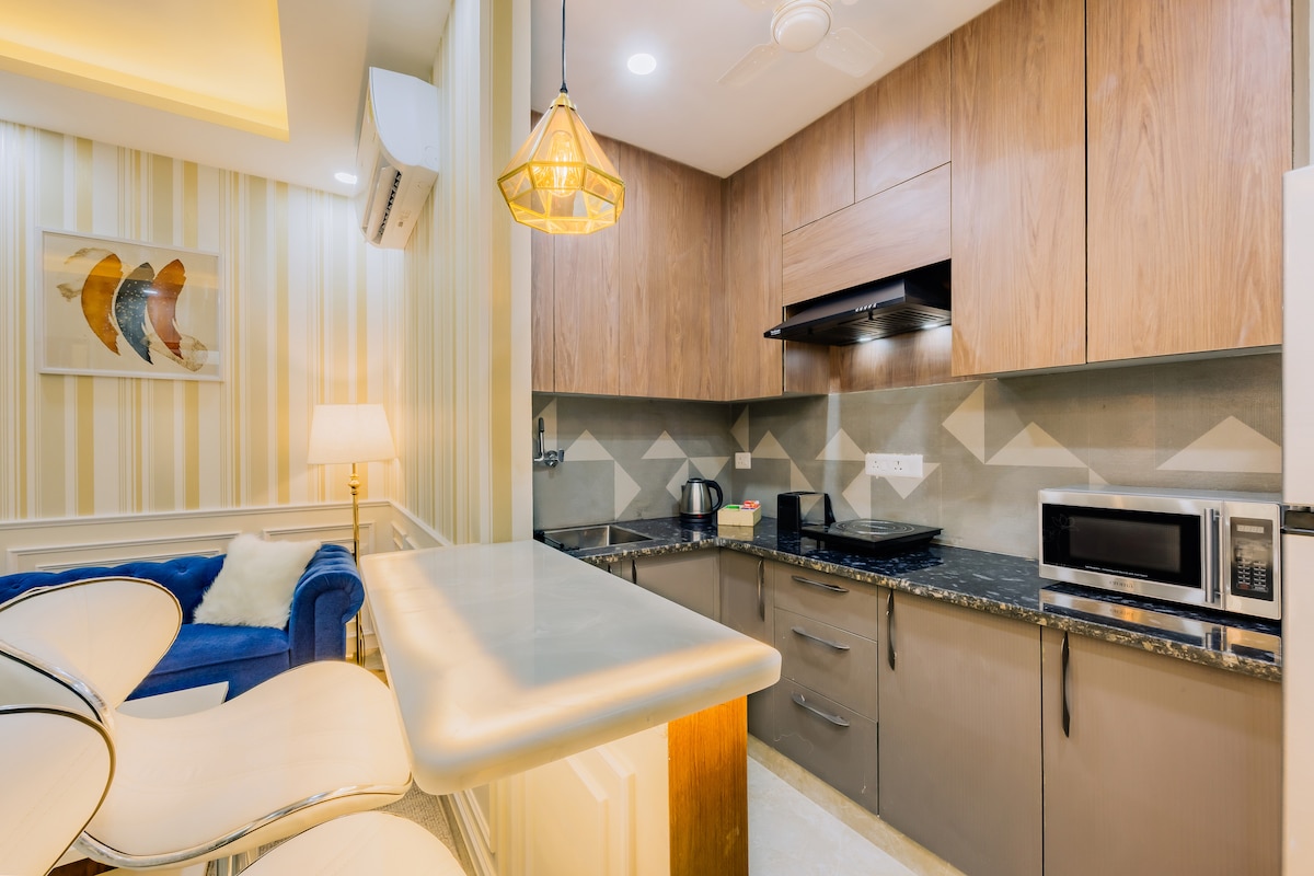 Apartamento de servicio premium 1BHK en el sector 43, Gurgaon con aire acondicionado en el salón y el dormitorio, además de una cocina con inducción, microondas y cubiertos. En una zona elegante, a poca distancia del centro comercial Gold Souk y de la escuela Shalom Hills, a 2,2 km de la estación de metro Millennium City Centre y a 2,1 km del hospital Fortis. Los huéspedes extranjeros son bienvenidos. El registro de entrada anticipado estará sujeto a disponibilidad y tendrá un cargo de 500 rupias, así como el registro de salida después de la hora establecida, que también tendrá un cargo de 500 rupias por cada 3 horas posteriores.