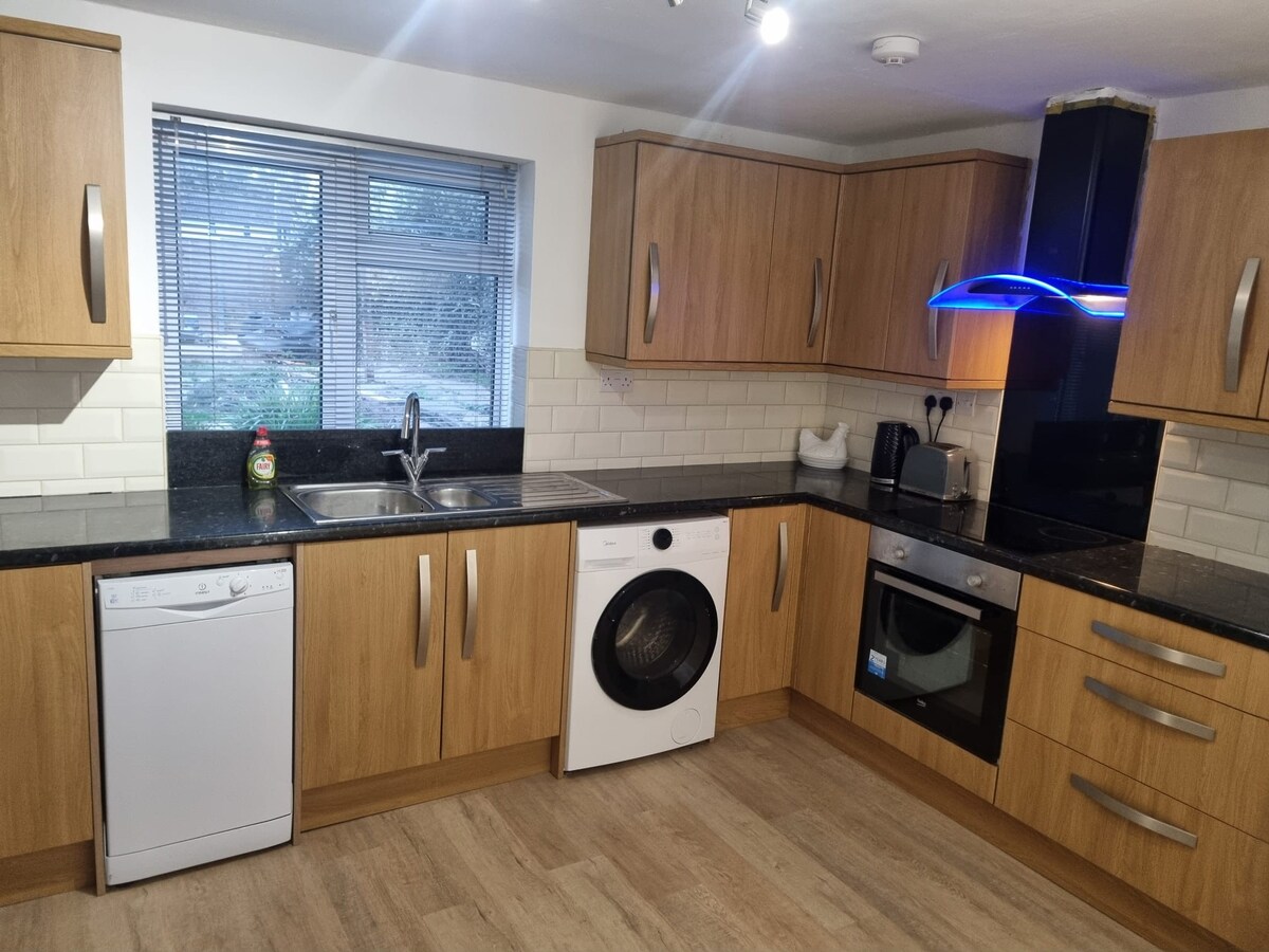 Modern accommodation with large double bedroom en suite. Walk in shower. Shared utility room. Washing machine/dryer available on request. Parking by front door. Galley kitchen and fridge containing breakfast goodies. Large lounge/diner with double pull out sofa bed. Sky tv and internet (Sky Superfast). Shared large patio and own smaller patio with table chairs. Large garden with swings for toddlers and younger children. Footballs etc. available. Gate leading to canal with beautiful walks.