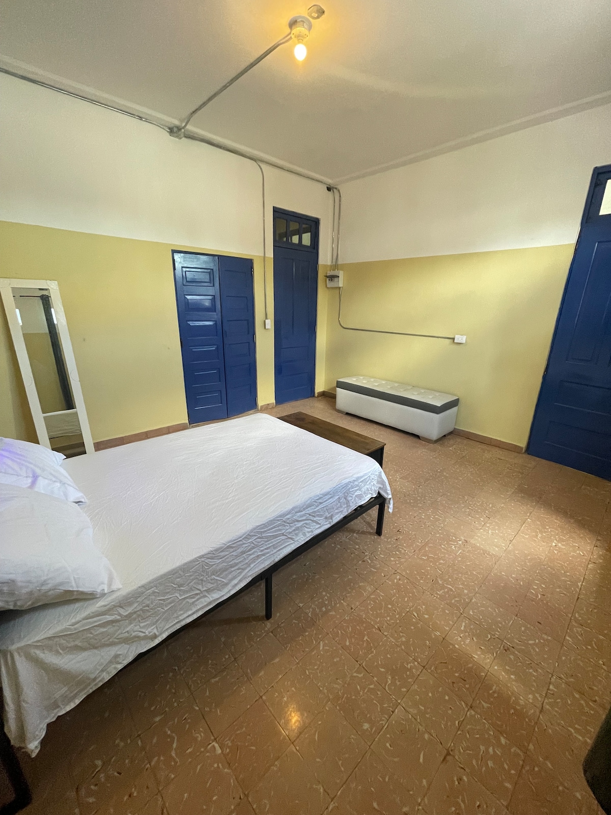 Este cuarto acogedor de estilo colonial cuenta con una cama matrimonial cómoda y una decoración minimalista en tonos cálidos con detalles en azul. Incluye un baño privado compacto, equipado con agua caliente, un elegante espejo redondo y una ducha práctica. El espacio también ofrece aire acondicionado. Ideal para quienes buscan comodidad y funcionalidad mientras exploran la ciudad.