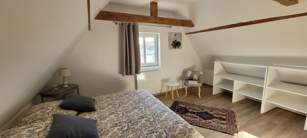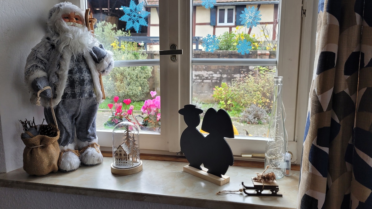 Vivimos en el campo, a 5 km de Haguenau, a 23 km de Estrasburgo y cerca de los Vosgos del Norte . Nuestra casa es de madera; se alojará en una parte de ella (2 habitaciones en dúplex - Dormitorio y Espacio de Oficina arriba - Sala de estar en la planta baja) en la parte posterior de nuestro alojamiento. Cómodo, tranquilo y luminoso, este alojamiento es perfecto para una pareja. La entrada es privada. Las ventanas de la vivienda dan al jardín. Podrá disfrutar del terreno.