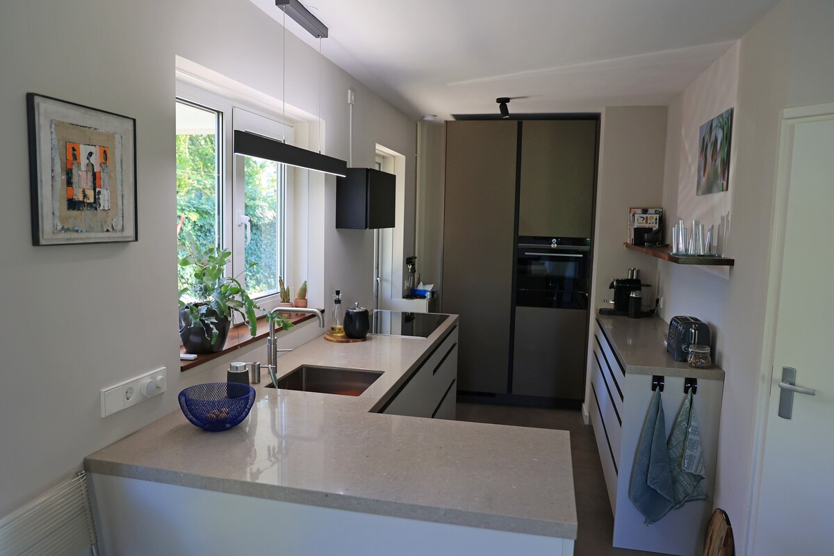 Esta nueva casa verde en el bosque es una casa completa de 2021 diseñada y construida por los propios dueños. Es un lugar para disfrutar al máximo. Este alojamiento se encuentra en 6500 m2 de propiedad privada. Se llega a la casa a través de un sendero forestal privado. A través de las puertas dobles del jardín puedes ir caminando por el gran jardín vallado. El interior es colorido y lujoso. El jardín florido ofrece muchos lugares con sol y sombra con bancos de picnic y césped de juegos. Estacionamiento en propiedad privada. Perros y niños pequeños en consulta.