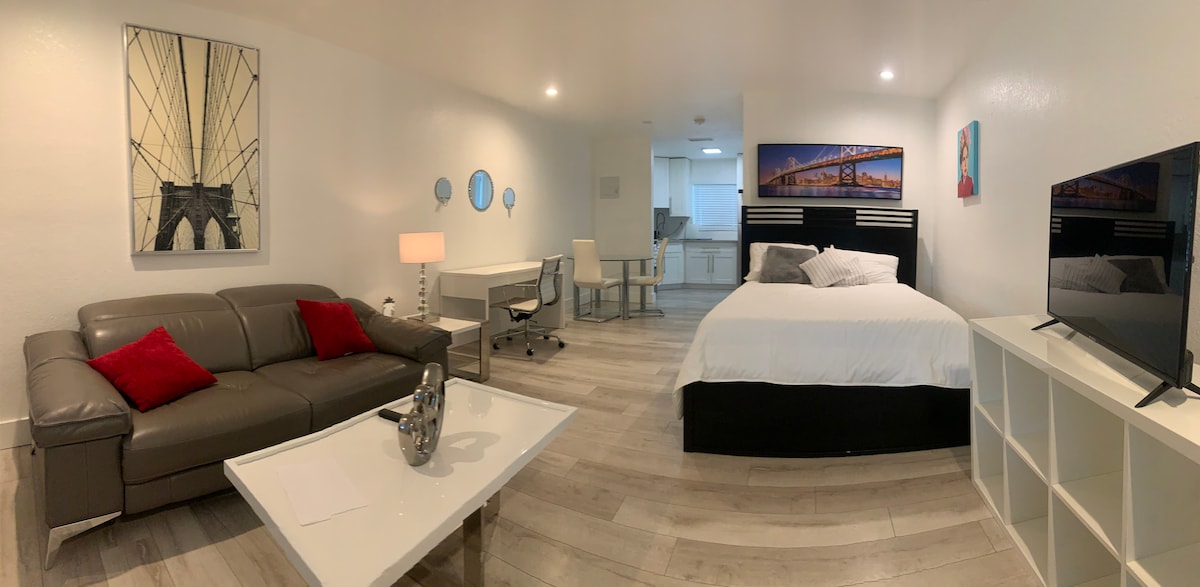 Te damos la bienvenida a nuestro estudio privado que ofrece una sola plaza de aparcamiento, entrada privada, baño privado, colchón de espuma viscoelástica de tamaño completo, wifi, TV con canales locales y aplicaciones inteligentes para que puedas acceder y ver tus servicios de streaming. El estudio está bien ubicado y cerca de autopistas, tiendas, restaurantes y la playa.