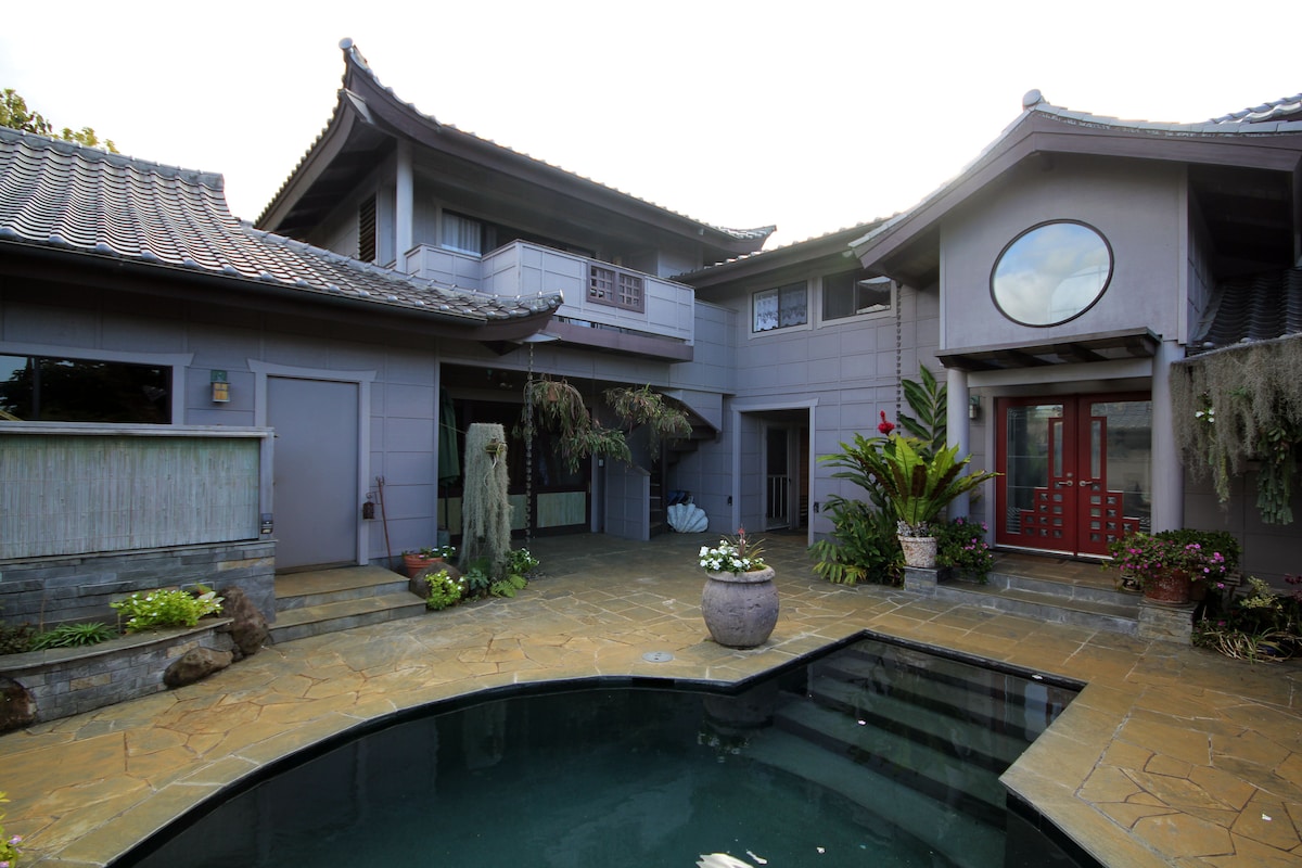 Asia House, se encuentra en un acantilado en Princeville, en la espectacular orilla norte de Kauai. El océano o Queen 's Bath está justo al otro lado de la calle. Hay playas en todo Princeville, todas dentro de 1-2 millas o menos. Princeville Resort es una joya en la bahía de Hanalei, conocida como una de las bahías y playas más hermosas del mundo. Esta ubicación es muy tranquila. Kauai lo tiene todo... paisajes espectaculares, gente amable, observación de aves, avistamiento de ballenas, snorkel, buceo, golf, senderismo y más.