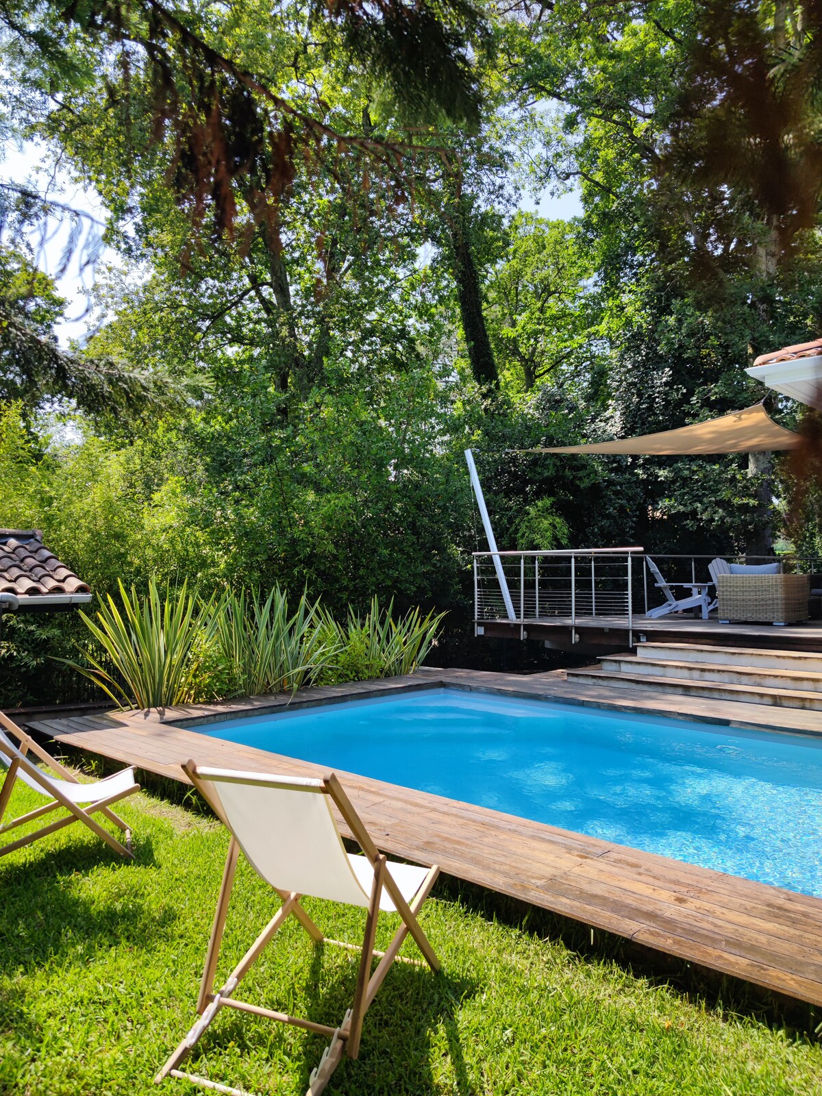 Este alojamiento tranquilo ofrece una estancia relajante para toda la familia. Casa luminosa de 160m2 distribuida en 3 niveles: un dormitorio con inodoro y cuarto de baño en el sótano, habitación con vistas abiertas a la piscina y gran baño en la planta baja,dos dormitorios con baño en la planta superior. Entre dos pequeños bosques, situada en una zona muy tranquila en un callejón sin salida, la casa tiene una vista de 180° de los Pinos.