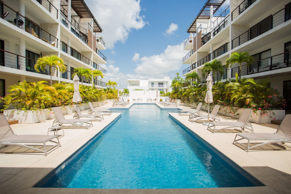 Disfruta de una estancia con estilo en este alojamiento céntrico y conveniente. A solo 5 min de centros comerciales y supermercados. Estamos muy cerca de la carretera hacia Tulum, Playa del Carmen y la Ruta de los Cenotes. El condominio cuenta con alberca y seguridad 24 h. A 15 min del aeropuerto y 7 min de la Zona Hotelera. **No se permiten niños menores de 6 años.