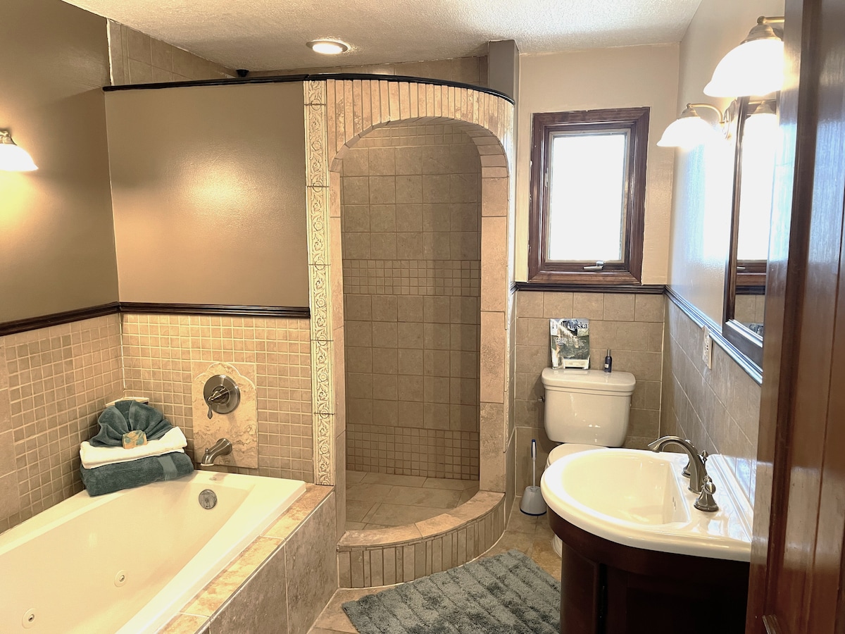 Un loft de 1 dormitorio con cama tamaño king, sala de estar, pequeña cocina y baño con ducha de tamaño razonable. Interior en tronco y tablón de abeto nativo. Una terraza cubierta de 262 pies cuadrados con jacuzzi privado. Esta es una estructura independiente a unos 35 pies de la casa principal. La fecha de finalización fue el 20 de mayo, comenzando las operaciones el 25/05/2022 hasta el 15 de octubre. Las fotos son muy actuales con diseños de césped y roca para un patio totalmente vallado. Esta cabaña tiene un atractivo rústico muy elegante. Las obras de madera son de abeto de Alaska Bettle Kill. Tim y yo lo construimos.