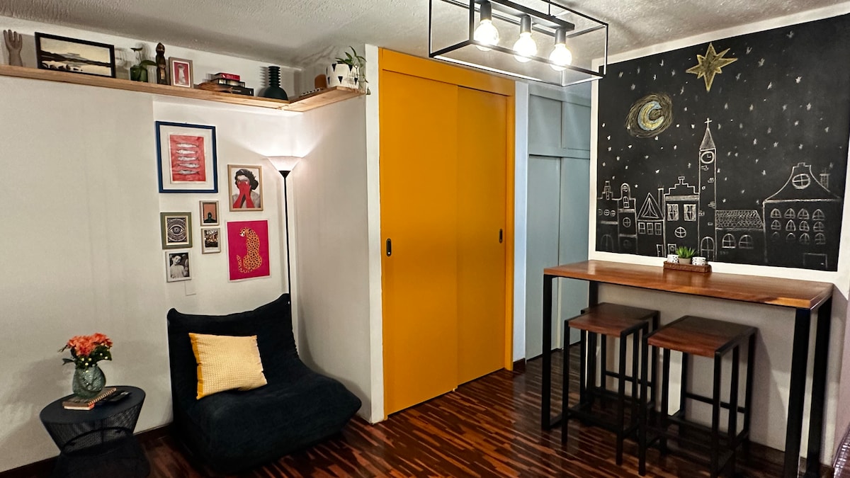 Disfruta de la libertad de una espacio intimo para ti sólo, con todas las comodidades de un hogar acogedor, ubicado en zona de muy fácil acceso, ideal para visitas de negocios o turismo. Transporte Público hasta la puerta, restaurantes, farmacias y la facilidad de estacionar dentro del edificio las 24 horas con puesto de estacionamiento propio. Además, cuenta con Cocina, lavadora-secadora, Wifi, Tv, Calentador y Microondas