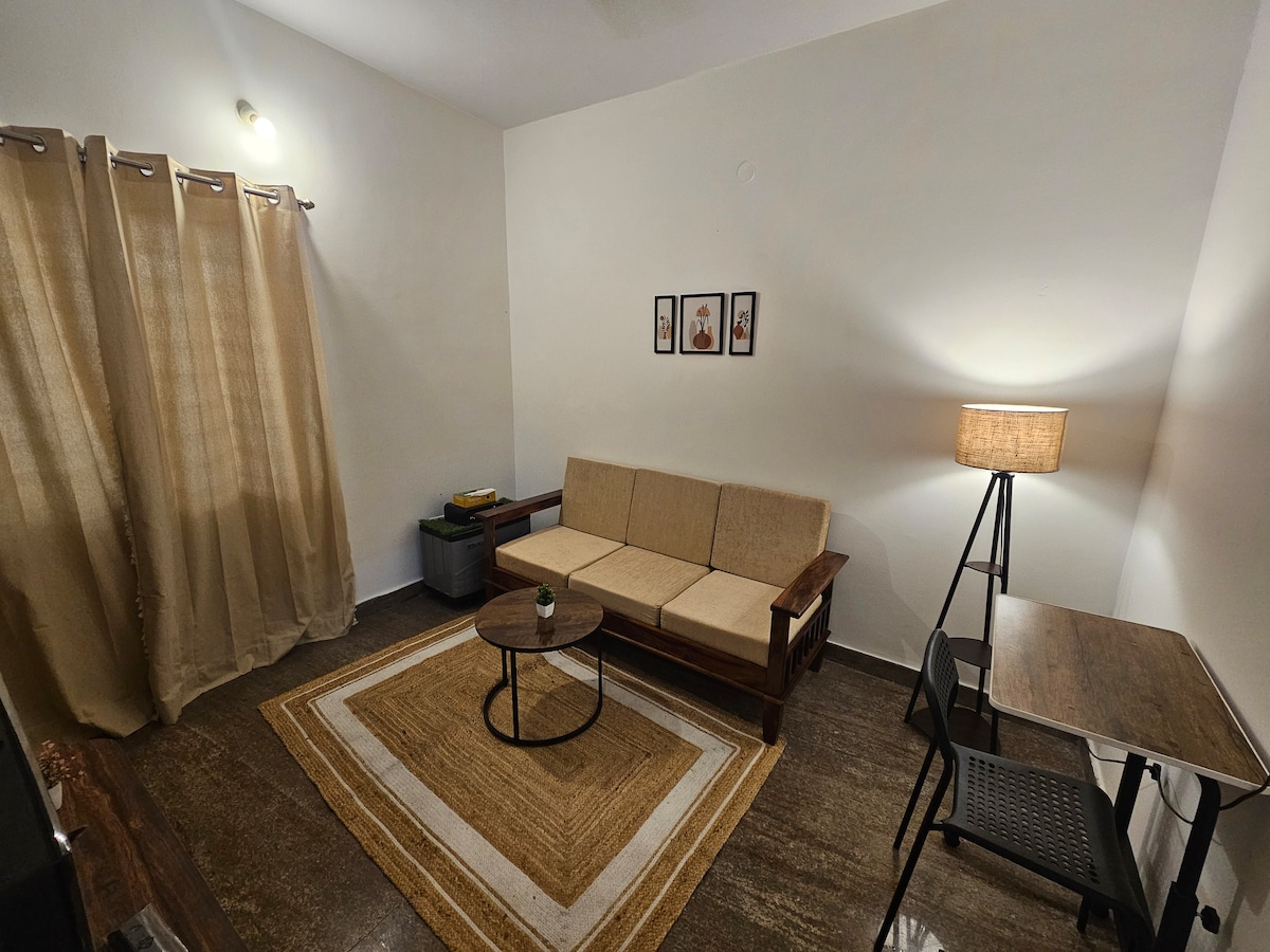 Nos encantaría hospedarte en nuestro 1 BHK (EARTHY Homestay) que combina estilo con un ambiente terroso y tranquilo y panoramas inmejorables. - Balcón Oasis: vistas al bosque + puestas de sol cinematográficas a 200 m - Prime Locale: 2 minutos a NIFT y 3 minutos a las cafeterías, boutiques y comida callejera de 27th Main - Interiores serenos: cama tamaño queen, iluminación ambiental y exuberantes plantas vivas - Trabajo y ocio: wifi de alta velocidad, TV grande y aire fresco Disfruta de estilo, serenidad y puestas de sol espectaculares, ¡todo en un acogedor refugio! - 5ª planta (sin ascensor)