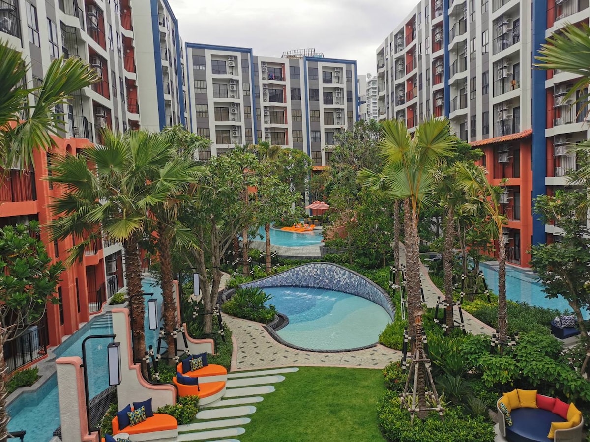 Disfrute del amanecer en el balcón del octavo piso. Un nuevo apartamento totalmente equipado en el corazón de Hua Hin ofrece relajación y diversión. La Casita, inspirada en la arquitectura española con unas dimensiones únicas y una gran piscina, se encuentra a solo 300 metros de la playa. Nos encanta este hermoso apartamento, especialmente las mecedoras de diseño en el balcón.