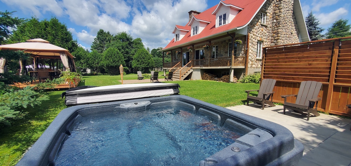 Ubicado a lo largo del río Rojo en una propiedad de 8 acres, tendrás todo el chalet para ti. Diseñado para darte privacidad y hermosas vistas de las tierras de cultivo circundantes, es un gran lugar para relajarte. Las gallinas deambulan libremente en verano. Chimenea de leña para los días fríos. Hermosa playa cercana. Actividades para toda la familia en Mont Tremblant a solo 15 minutos, escalada en roca en Montagne d'Argent o simplemente pasar el día relajándote en la granja. Carreteras tranquilas cercanas para andar en bicicleta o pasear al perro.