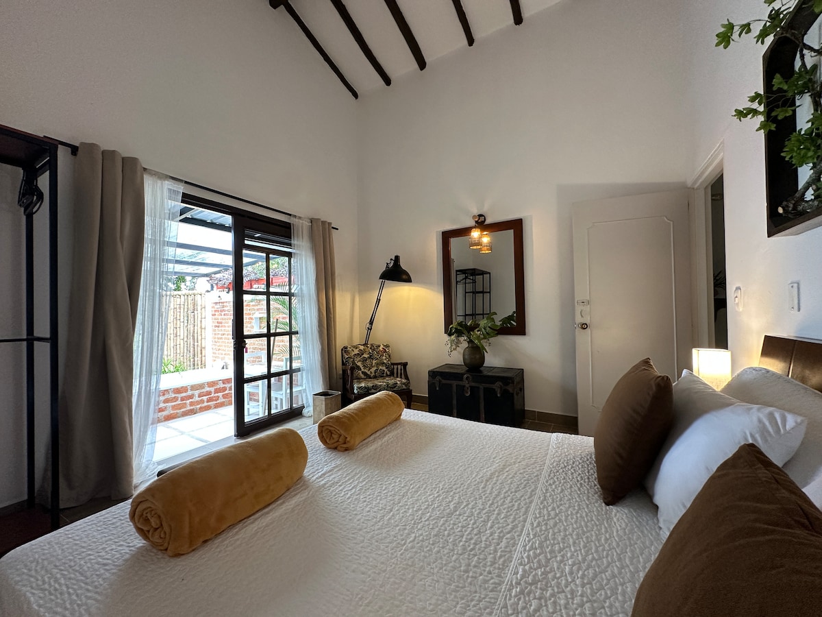 Hermosa habitación de hotel boutique, con terraza en primer piso, vistas al jardín, baño privado con ducha caliente, aire acondicionado, escritorio de trabajo, uso de espacios comunes, zona de lectura, terraza, recepción 24 horas