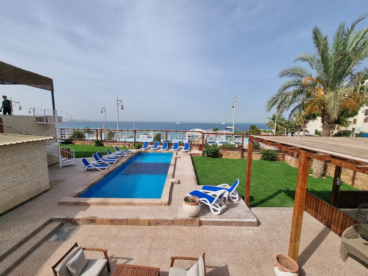 Una suite con servicios de lujo frente a la playa con una vista encantadora. Servicio de limpieza una vez gratuito cada 3 días. El check-in en la habitación es a las 14:00 y el check-out a las 12:00 h. La mejor ubicación en el corazón de Hurghada: Sheraton Road está cerrada a todos los restaurantes, cafés, mercados, tiendas y bancos. Y a pocos pasos del café de la Costa. La ubicación está a solo 5 minutos en coche del puerto turístico de Hurghada y a 20 minutos del aeropuerto de Hurghada. El transporte está disponible en esta mejor área las 24 horas.